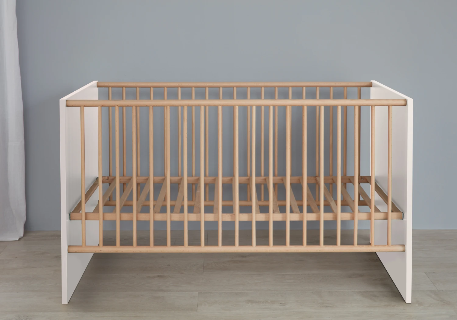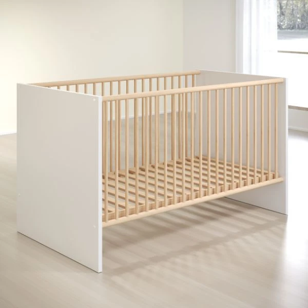 Kortom, het moderne babybed met zijkanten in massief beuken en in hoogte verstelbare lattenbodem in wit melamine is een stijlvolle, functionele en duurzame keuze voor de kamer van je kind. Het moderne ontwerp, de maximale verstelbaarheid en de FSC®-certificering maken het een waardevolle aanvulling voor elke kinderkamer.