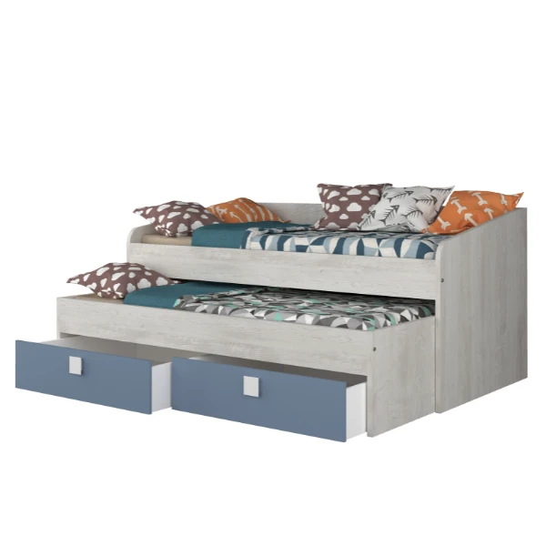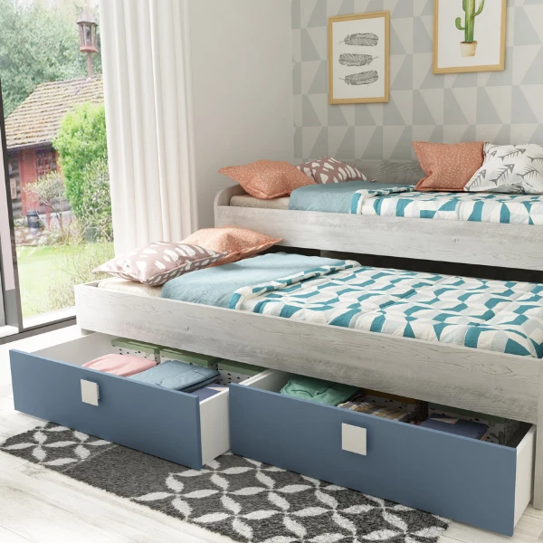 Een vriendje dat komt spelen en graag wil blijven slapen? Geen probleem! Met bed Bo12 heb je altijd plaats voor een onverwachte logรฉ. Het bed is namelijk uitgerust met een onderschuifbed. Hierdoor is er plaats voor twee matrassen: een van 90 bij 200 cm (bovenste bed) en een van 90 bij 190 cm (onderschuifbed). Deze matrassen zijn, net zoals de lattenbodems, niet inbegrepen, maar kunnen wel aangekocht worden op onze website. Het onderschuifbed en de lades kunnen bovendien gemakkelijk met รฉรฉn hand vanonder het bed geschoven worden. De lades zijn voorzien van vierkante handgrepen.