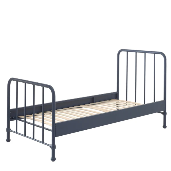 Dit metalen eenpersoonsbed 209x99x110 cm en nachtkastje 40x40x61 cm in mat denim blauw met industriรซle uitstraling vallen perfect te combineren met andere stijlen. Het bed is geschikt voor eenย matras en een lattenbodem van 90 x 200 cm. Deย lattenbodemย isย inbegrepenย in de aankoop. Bij dit bed raden we je onze Comfort matras aan, die je ook op onze site kan aankopen.