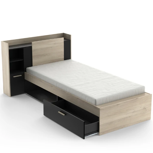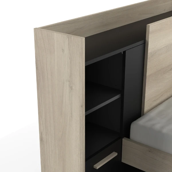 Deย lichte houtaccenten in Kronberg eikdecorย en hetย stoere matzwartย maken dat dit bed perfect geรฏntegreerd kan worden binnen eenย industriรซleย woonstijl. Hetย hoofdbordย beschikt overย 2 open vakkenย waarin boeken en decoratie uitgestald kunnen worden en deย opbergruimte achter de draaideurย kan alsย nachtkastjeย gebruikt worden. Op hetย blad van het hoofdbordย kunnen nog een wekker en een nachtlampje geplaatst worden. Onder het bed is eenย open vakย voor het opbergen van boeken, gezelschapsspelletjes en puzzels en in deย ladeย is er plaats voor beddengoed. Combineer slapen en opbergen in รฉรฉn metย bed Liva!ย