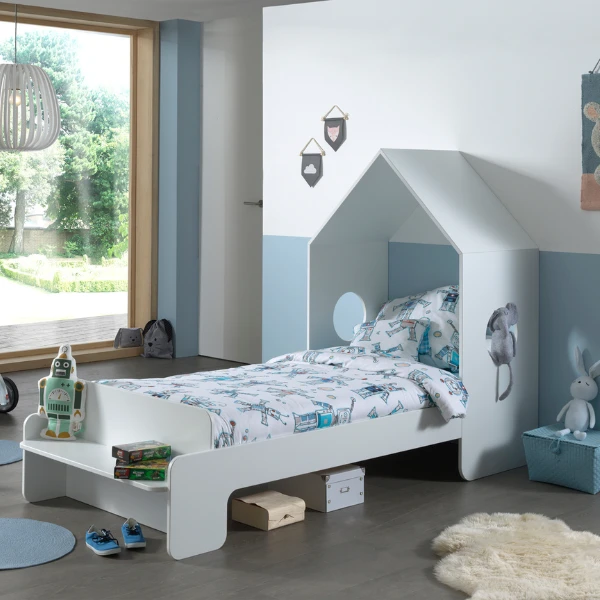 Kinderkamer Casami bestaat uit een kleerkast 58x172x37 cm en een bedhuisje van 90×200 cm (matras van 90×200 cm niet inbegrepen). De kamer is gemaakt uit wit en muntgroen gelakt MDF.ย