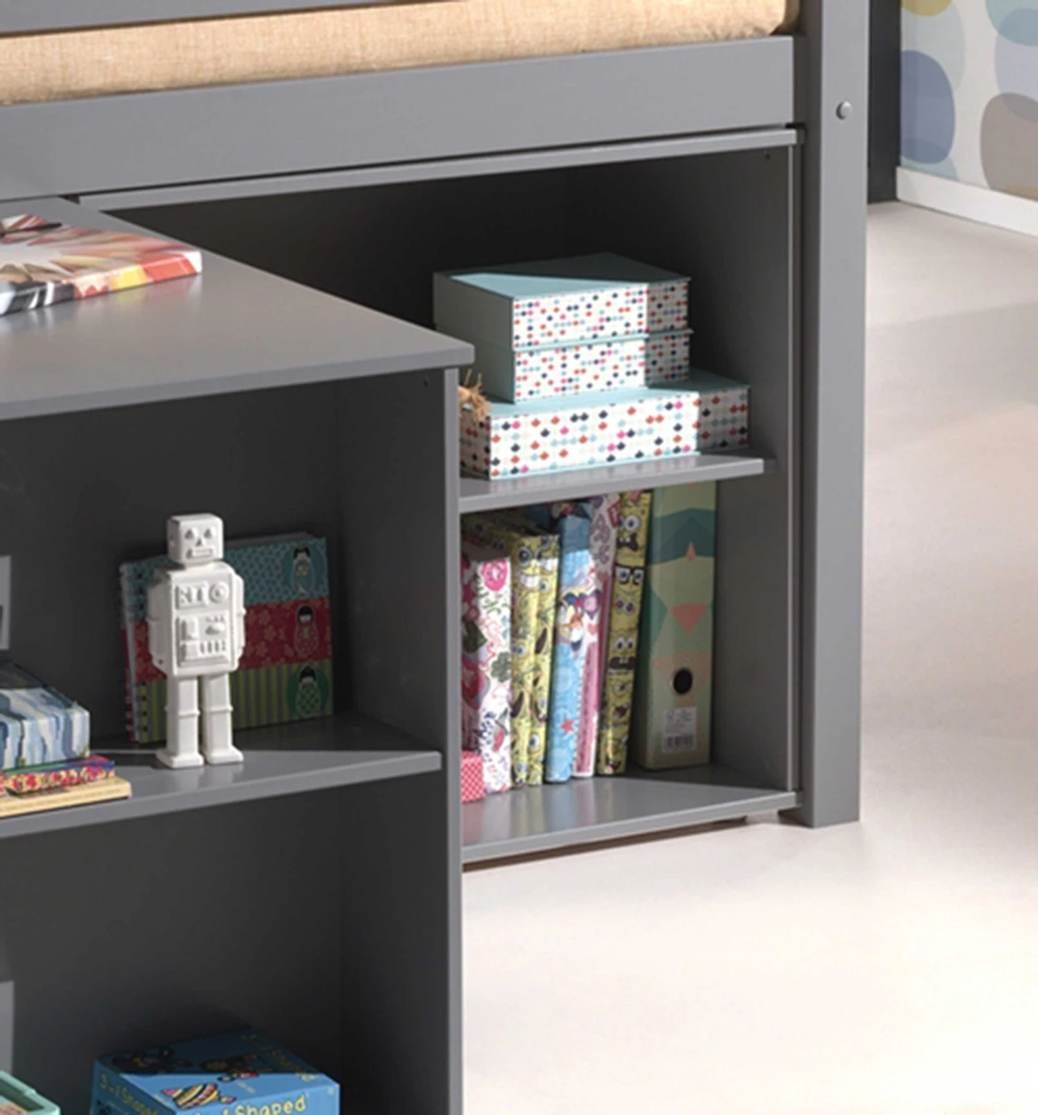 Deze grijze boekenkast is gemaakt uit massief den en is geschikt om onder de halfhoogslaper Charlotte te plaatsen. Er zijn 2 open opbergvakken waarin je allerlei kleine spulletjes kan opbergen. Een absolute aanrader!
