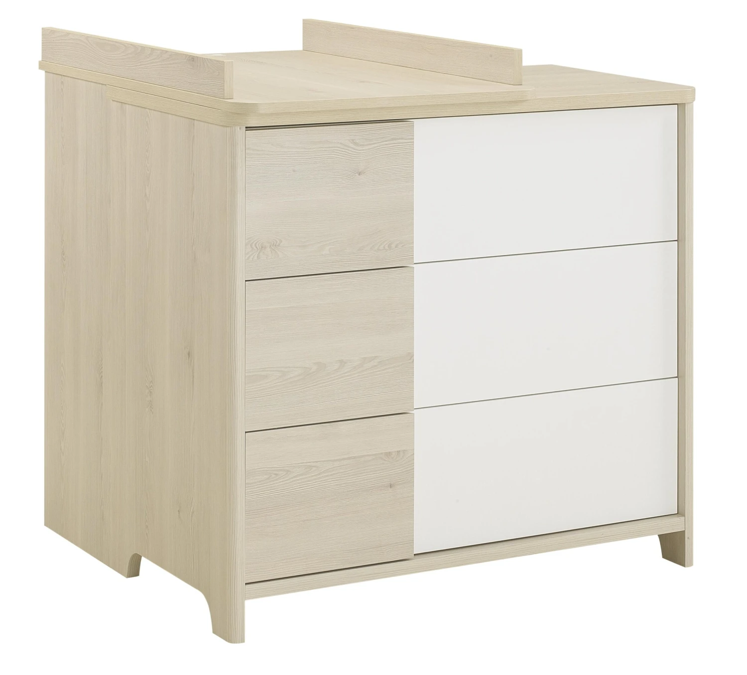 Een tijdloze kinderkamer, daar kan je voor zorgen met de meubelen van de Binno-collectie uit spaanplaat. De combinatie van het decor van gebleekte eik met de witte oppervlakken ziet er strak uit, maar is op hetzelfde moment heel gezellig. In de drie lades van de commode kan je heel wat gerief opbergen. Het is heel handig om hier verzorgingsspullen op te bergen, want je kan de commode transformeren tot verzorgingstafel als je het bijhorende artikel aankoopt. Vervolledig met het opbergrek Binno en je verzorgingshoek is helemaal compleet. De lades hebben schokdempende remmen voor een soepele sluiting.