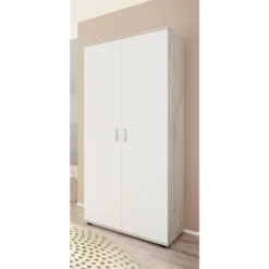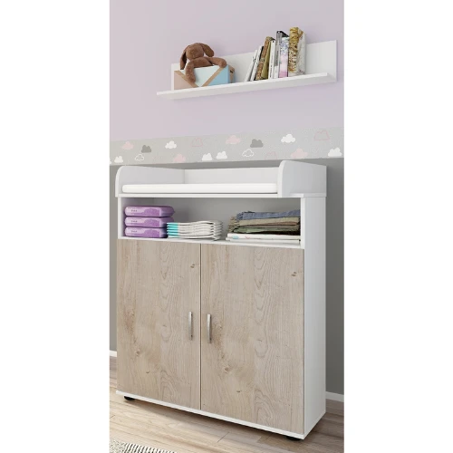 Commode Halula is gemaakt uit gemelamineerde spaanplaat in wit en eikdecor en bestaat uit een luierplank, open vak, 2 draaideuren, 1 legplank en 1 wandplank.