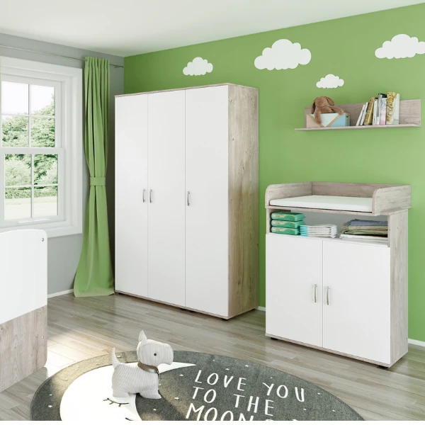 Dezeย eenvoudige, commode in zacht eikdecor met strakke witteย deurenย biedt alles wat u nodig heeft voor de verzorging van uw kleintje. Zo beschikt hij overย een luierplankย om uw baby te verversen, eenย open vakย waar u luiers, vochtige doekjes en tetra doeken kunt opbergen,ย 2 opbergvakken achter de 2 draaideurenย voor allerhande verzorgingsproducten en eventueel ook kleertjes van de baby en eenย wandplankjeย waar u kinderboekjes en decoratie kunt uitstallen.ย ย Deze commode maakt deel uit van deย Halula babykamerย maar kan ookย gemakkelijk gebruikt worden in elke andere babykamerย dankzij zijnย neutrale ontwerp. Het neutrale ontwerp en het feit dat uย de luiertafel opnieuw kunt verwijderenย maakt ook datย u deze commode kunt blijven gebruiken naarmate uw kind ouder wordt. Bekijk ook onzeย andere meubelen van de Halula babykamer.ย Schroeven en pluggen voor wandmontage zijn niet inbegrepen.ย