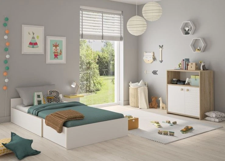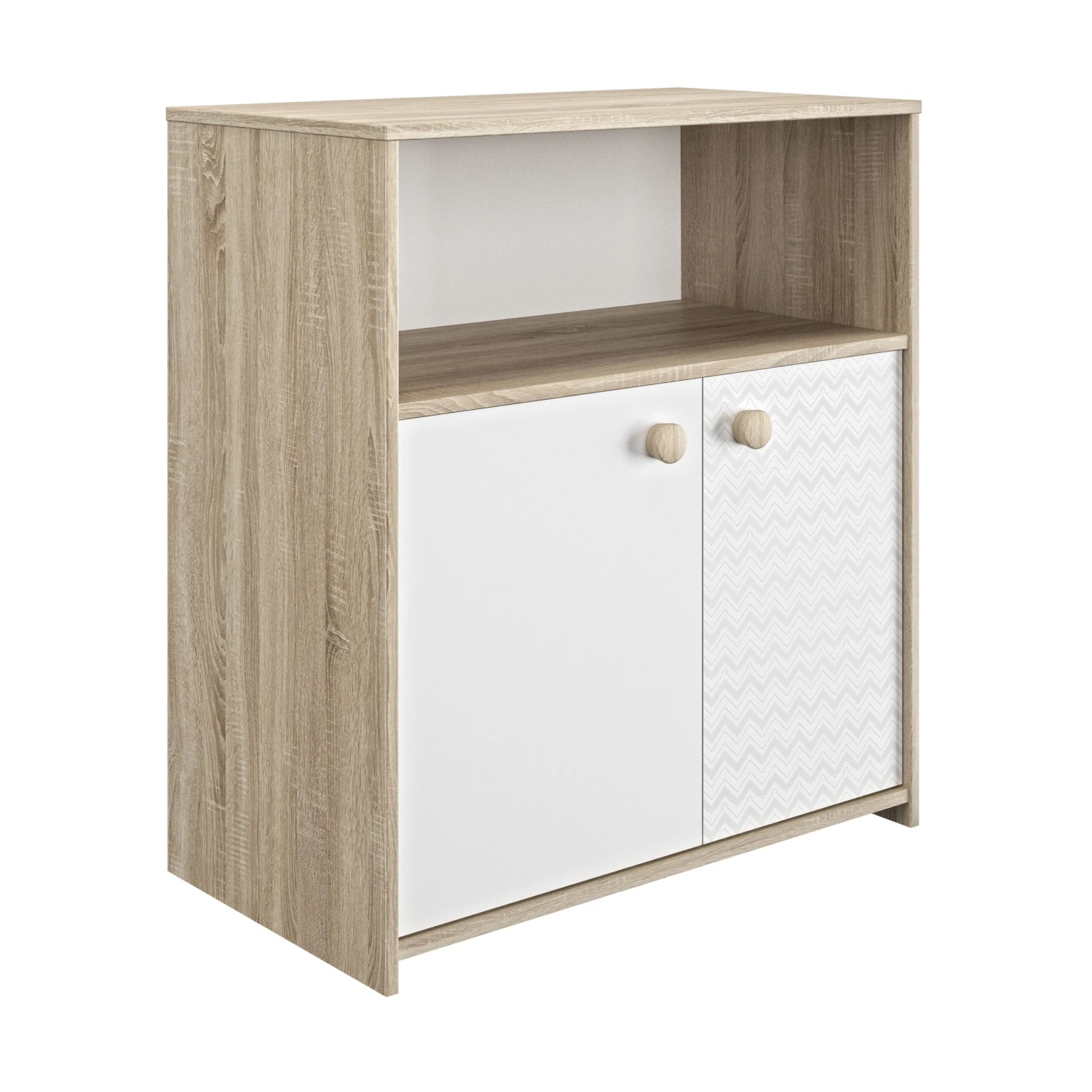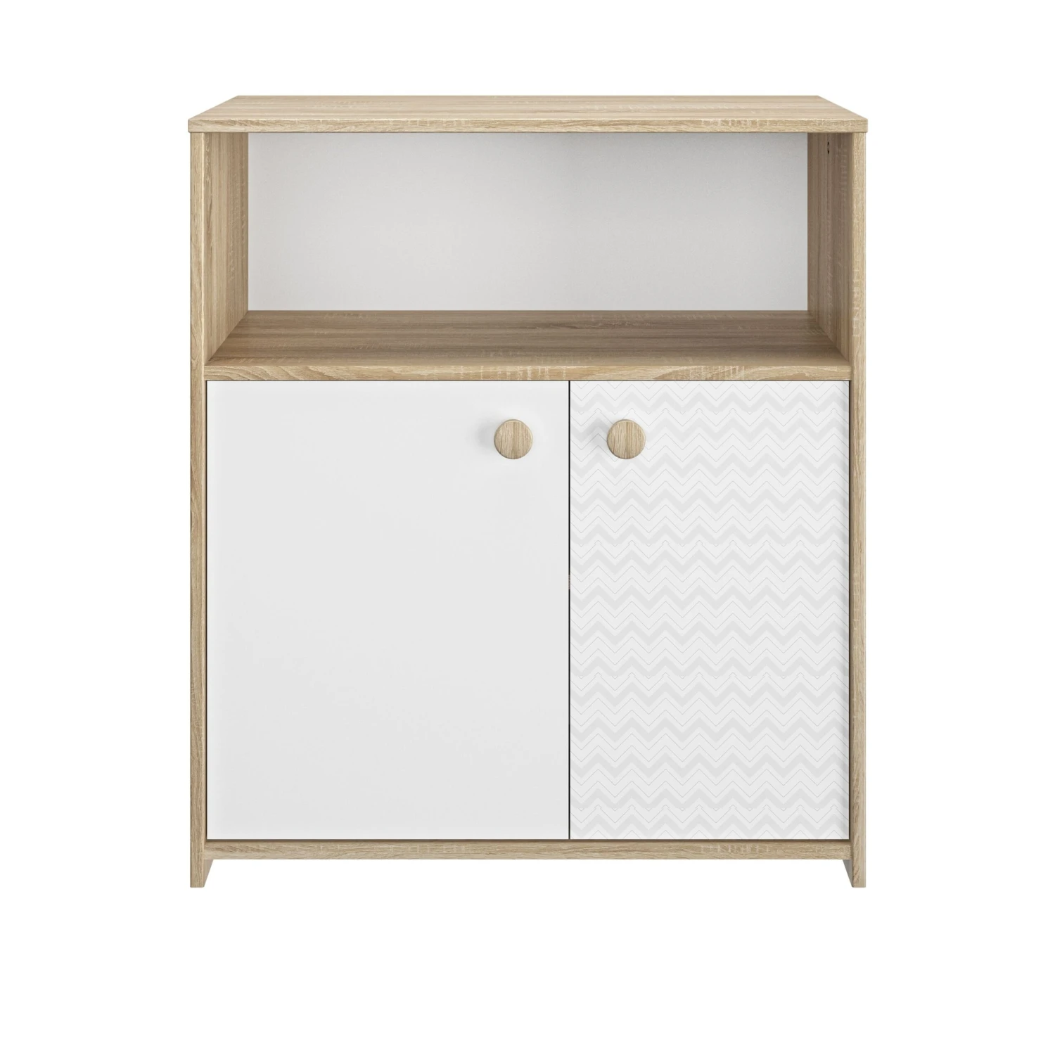 Met de meubelen van de Kamiel-reeks kan je kindje opgroeien in een gezellige en tijdloze slaapkamer. De meubels zijn gemaakt uit witte spaanplaat en afgewerkt met een eikdecor. Met de praktische commode van 77 op 87 cm vergroot je je opbergruimte, die je vaak goed kan gebruiken in de kinderkamer. Achter de twee deuren kan je spullen bewaren die je op afstand wil houden van die kleine handjes. De open nis is goed toegankelijk voor volwassenen. Op één van de twee witte deurtjes is er een lichtgrijs grafisch patroon dat het meubel een moderne uitstraling geeft. De commode kan ook dienen als verzorgingstafel wanneer je het bijhorend artikel toevoegt.