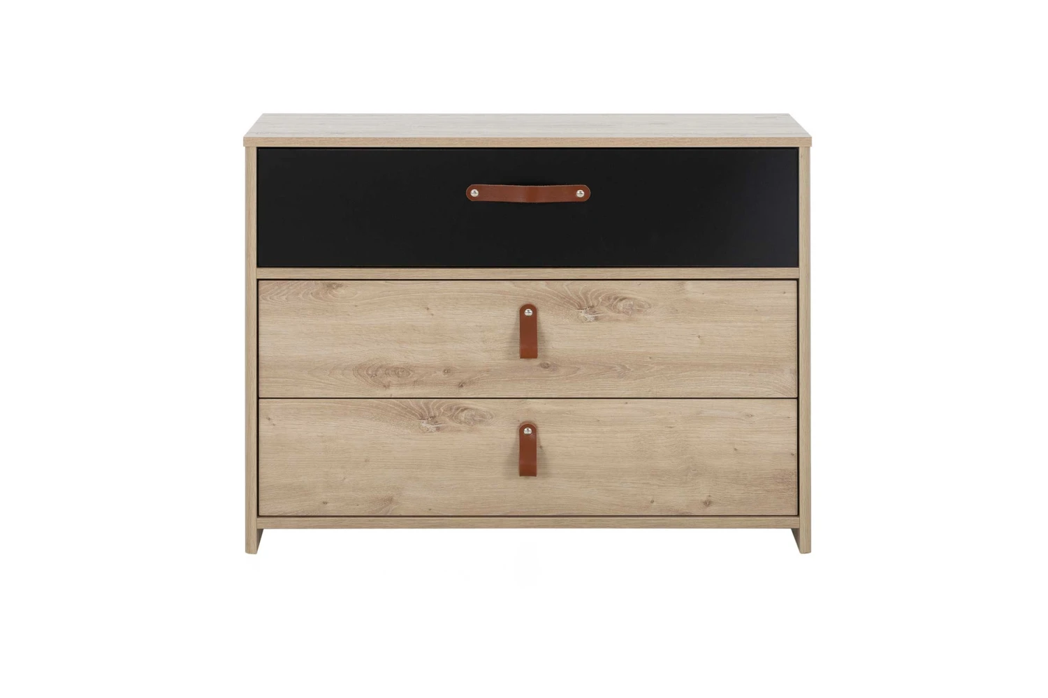 Deze commode uit de Liam slaapkamer is vervaardigd uit spaanplaat met een artisan eikdecor en is uitgerust met 3 lades waarin je je spullen kunt opbergen. De zwarte lade en bruine, lederen handgrepen geven een stoere toets aan de ladekast. Gemaakt in Frankrijk