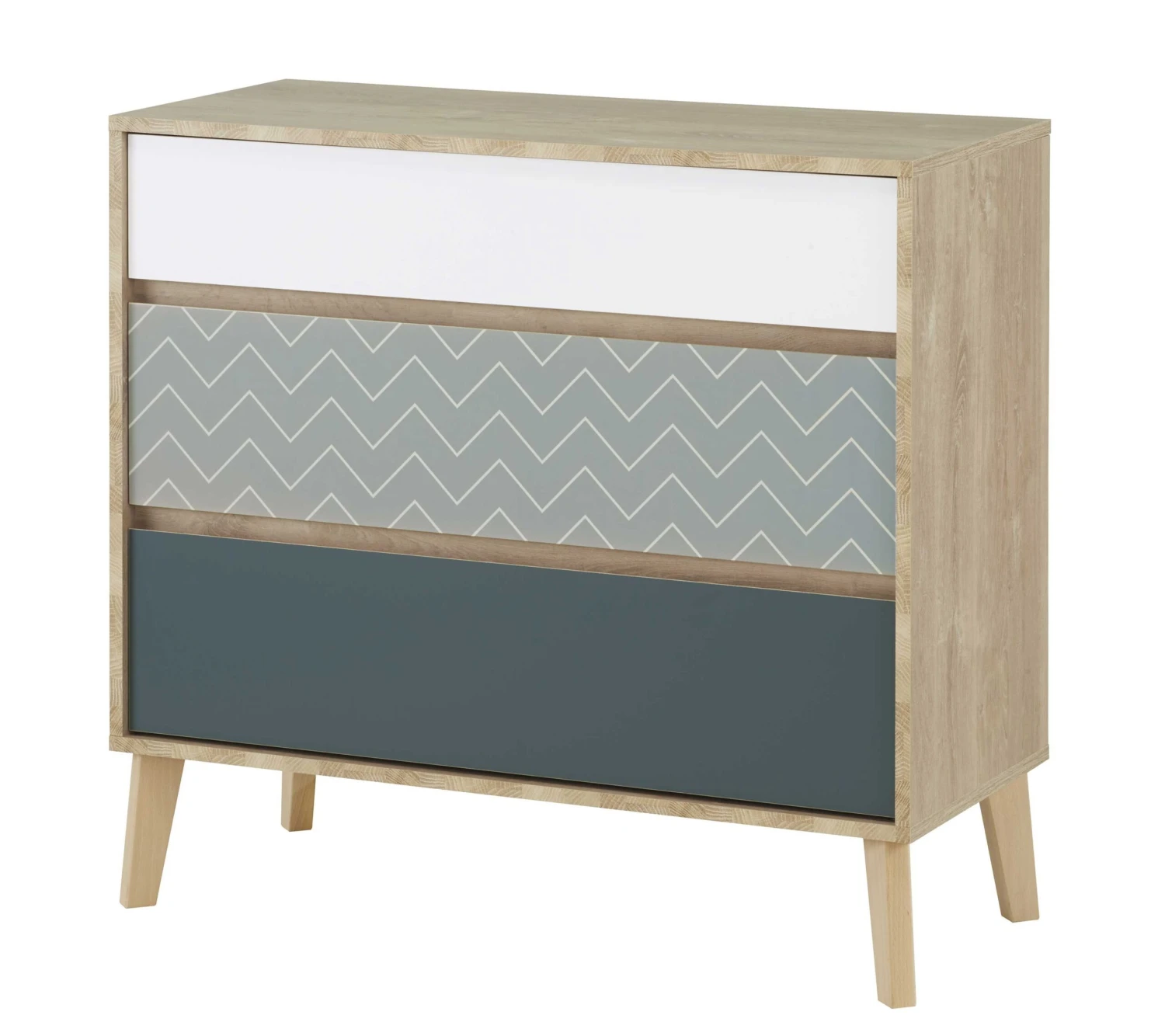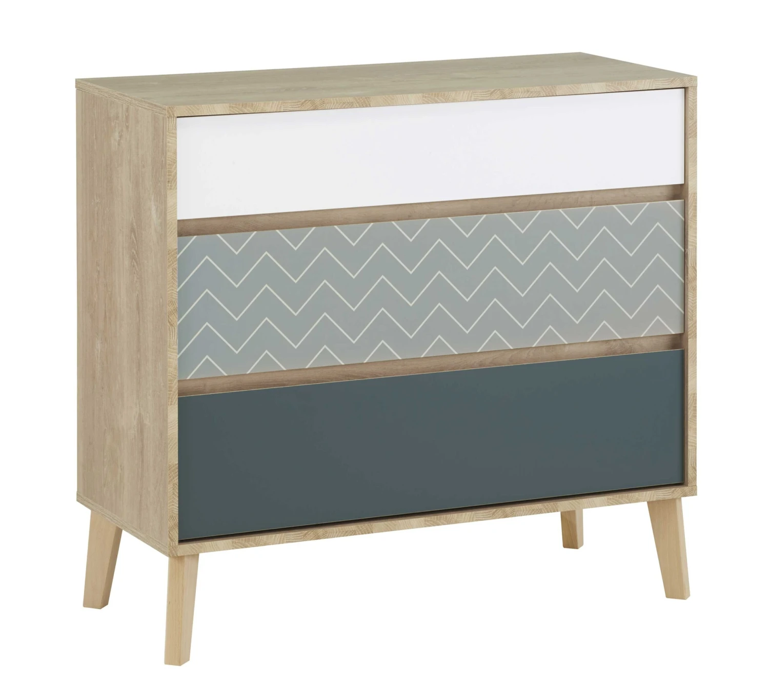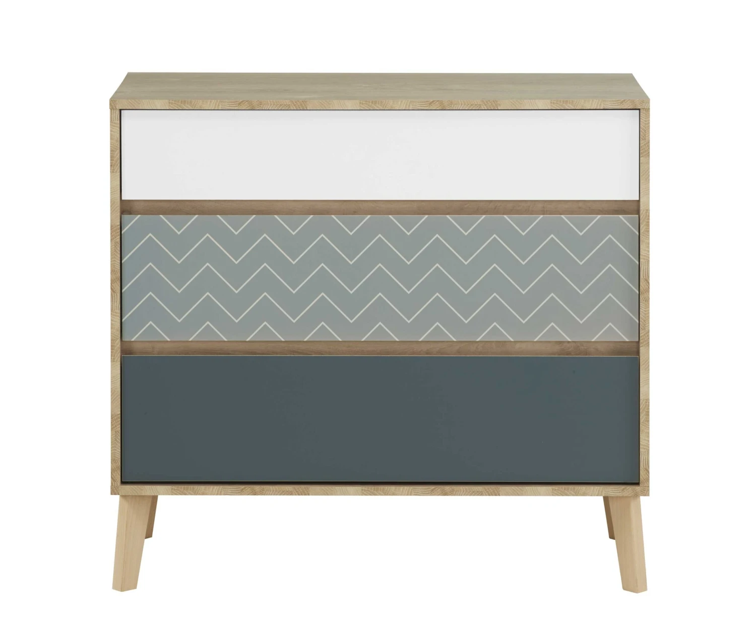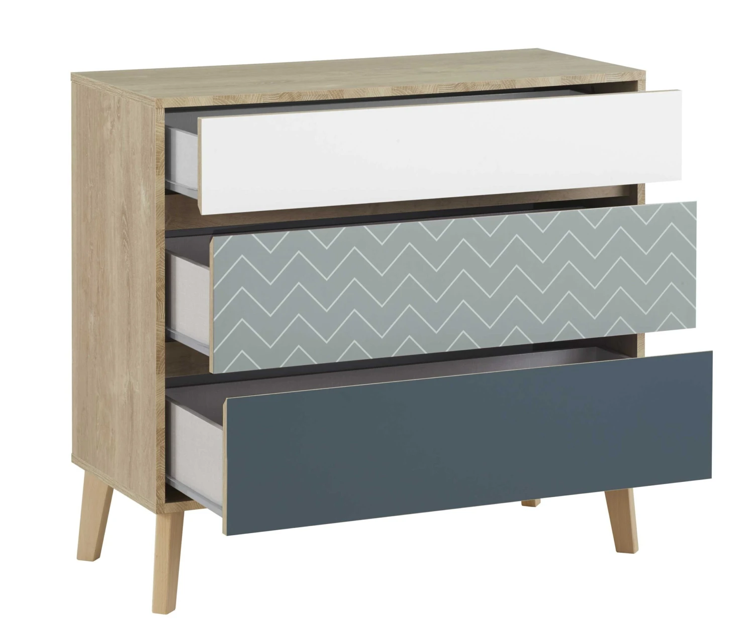 Deze commode biedt je voldoende plaats om t-shirts, truien en andere kledij op te bergen. De laden kregen allemaal een andere kleur (wit, kobaltblauw en oceaanblauw met visgraatmotief) en geven zo een bijzondere toets aan de kamer.