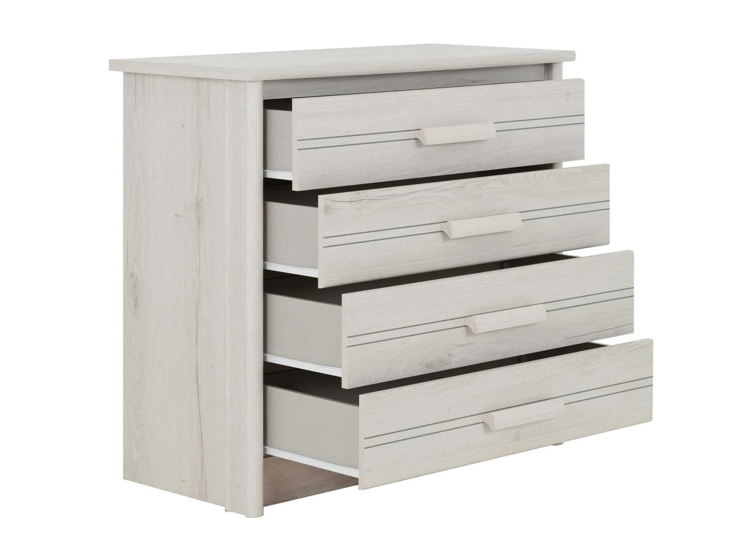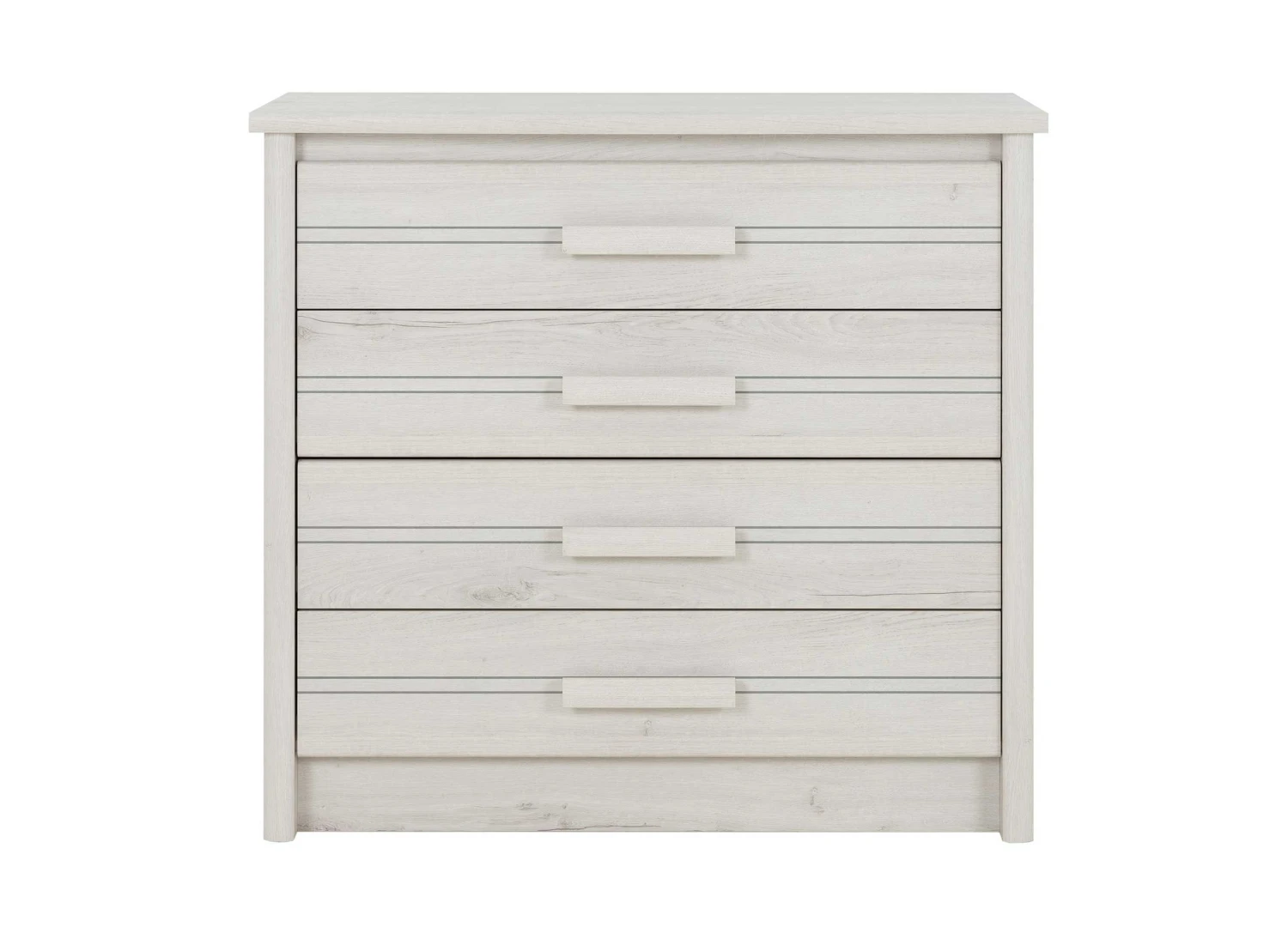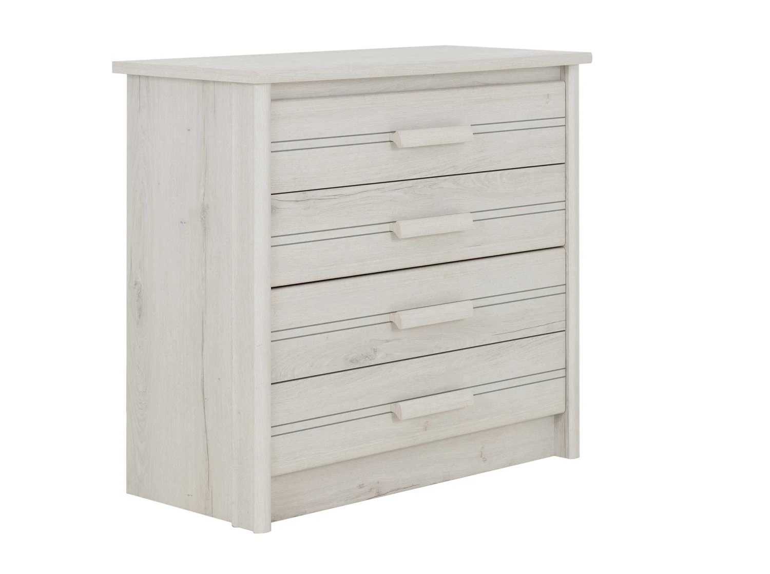 Commode Morris met 4 laden, gemaakt van spaanplaat met imitatieprint van gebleekte helvezia eik.