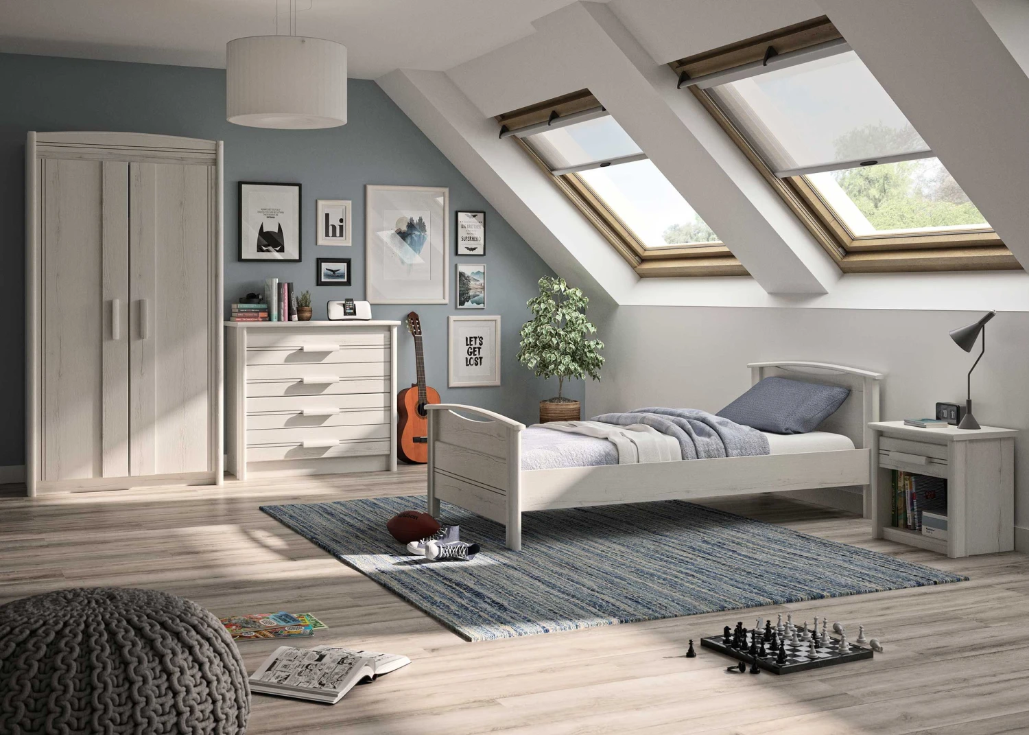 Investeer in een kinderkamer waarin je kind zijn volledige jeugd kan slapen, zoals kinderkamer Morris. De meubelen van deze collectie hebben een tijdloos design en gaan daardoor jarenlang mee. Ze zijn gemaakt van spaanplaat met een papieren imitatieprint van gebleekte helvezia eik.
