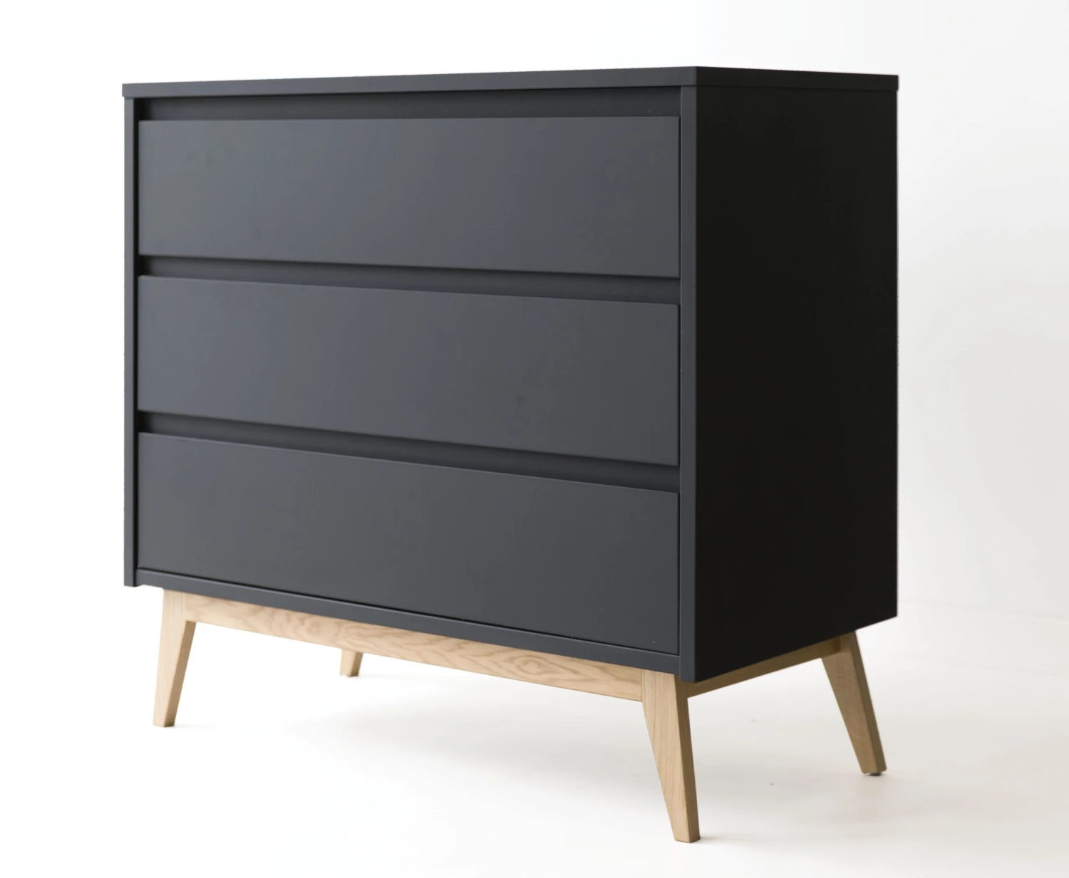 Commode Pure is gemaakt van zwart gelakte MDF en hout en past perfect in heel wat interieurstijlen. Deze commode heeft haar naam niet gestolen en is gekenmerkt door haar pure eenvoud, net wat jouw kindje nodig heeft. Dit meubel beschikt over 3 ruime lades met softclose-systeem. Er wordt ook een verlengstuk meegeleverd zodat je de commode ook als luiertafel kan gebruiken. Het maximale belastbare gewicht van het verlengstuk is 11 kg.