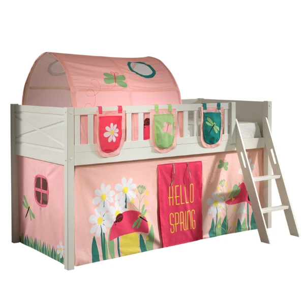 Halfhoogslaper Scottie met lente-speelgordijn, 3 opbergzakjes en bedtunnel, geschikt voor een matras van 90×200 cm. Gemaakt uit massief grenen en MDF. Inclusief lattenbodem.