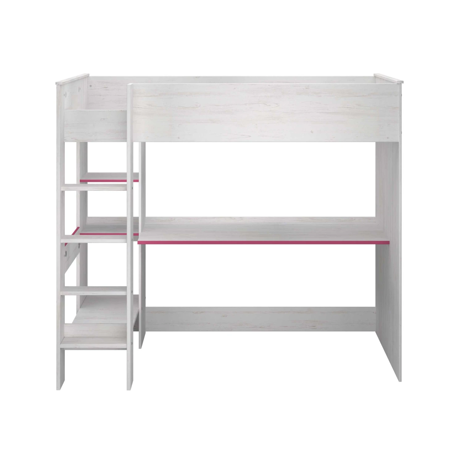 Deze hoogslaper Smoozy is wit van kleur met blauwe of roze accenten. Je bereikt het slaapgedeelte van deze hoogslaper via 4 stevige treden. Daaronder heb je een bureaublad en 3 legplanken. Deze budgetvriendelijke hoogslaper is multifunctioneel en bespaart je heel wat ruimte.