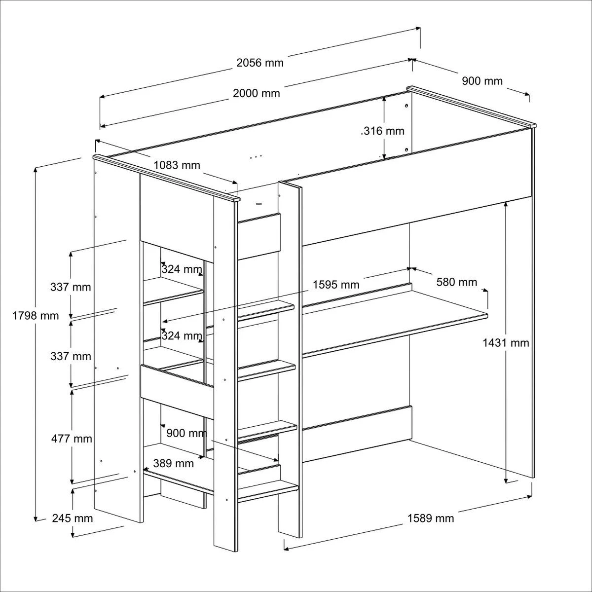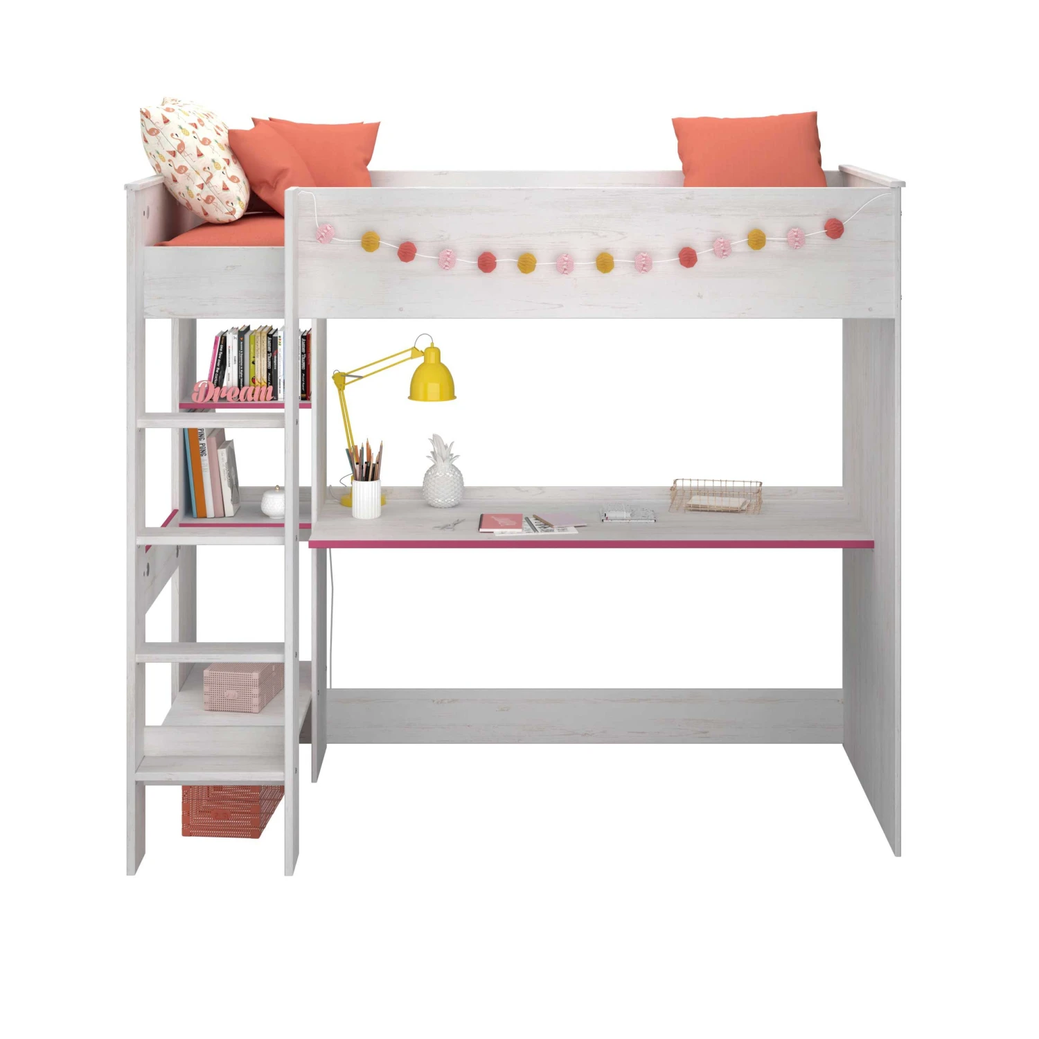 De afmetingen van het bureaublad zijn 159 cm lang en 58 cm breed. Tijdens de montage kan je kiezen voor roze of voor blauwe accenten. Deze hoogslaper is dus geschikt voor zowel jongens als meisjes. Let wel, je kan het bed enkel zoals op de foto monteren.