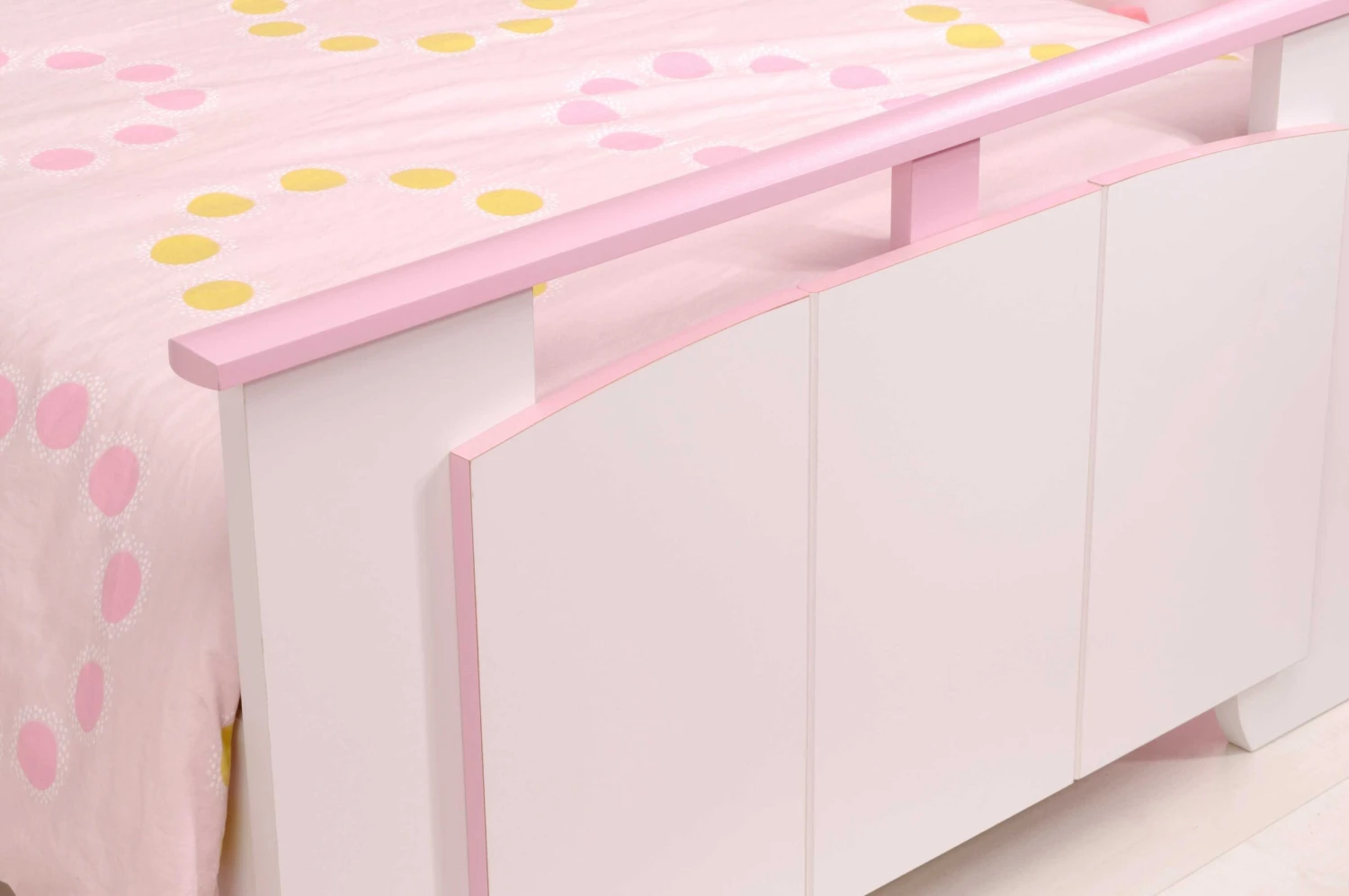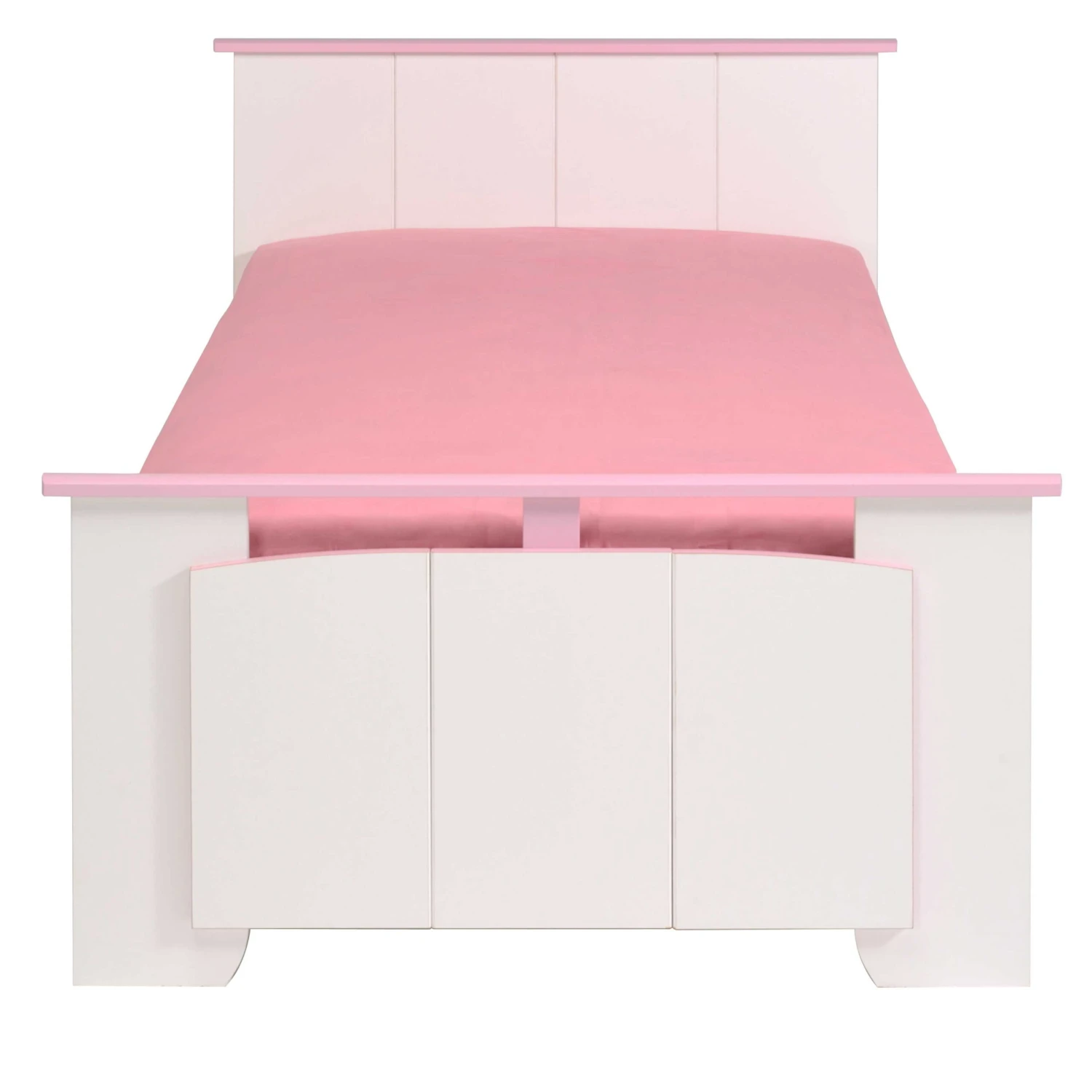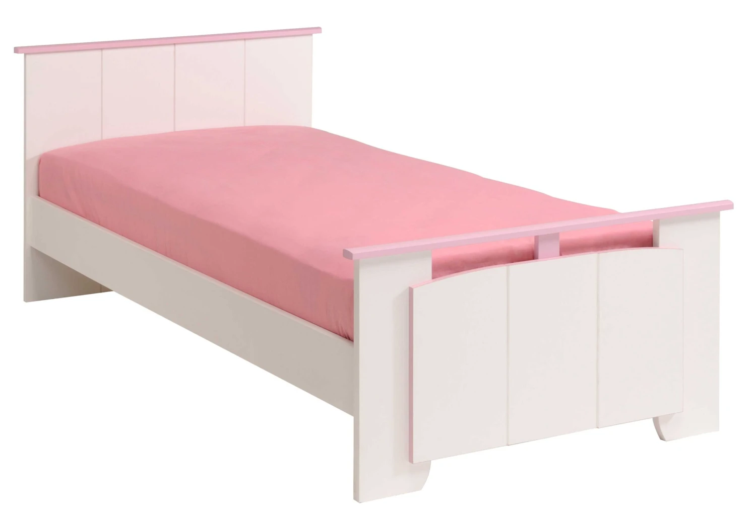 Mooi en stevig eenpersoonskinderbed in MDF en spaanplaat. Een wit design in combinatie metย frambooskleurige elementen. Het gefreesd lijnmotief in het hoofd- en voetpaneel zorgt voor een stijlvolle en ruimtelijke afwerking. In dit kinderbed zal jouw dochter zalig slapen en dromen.