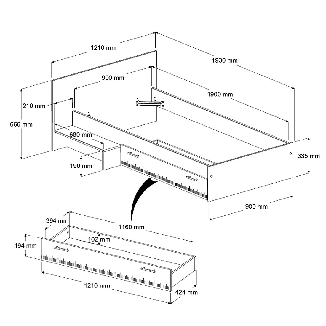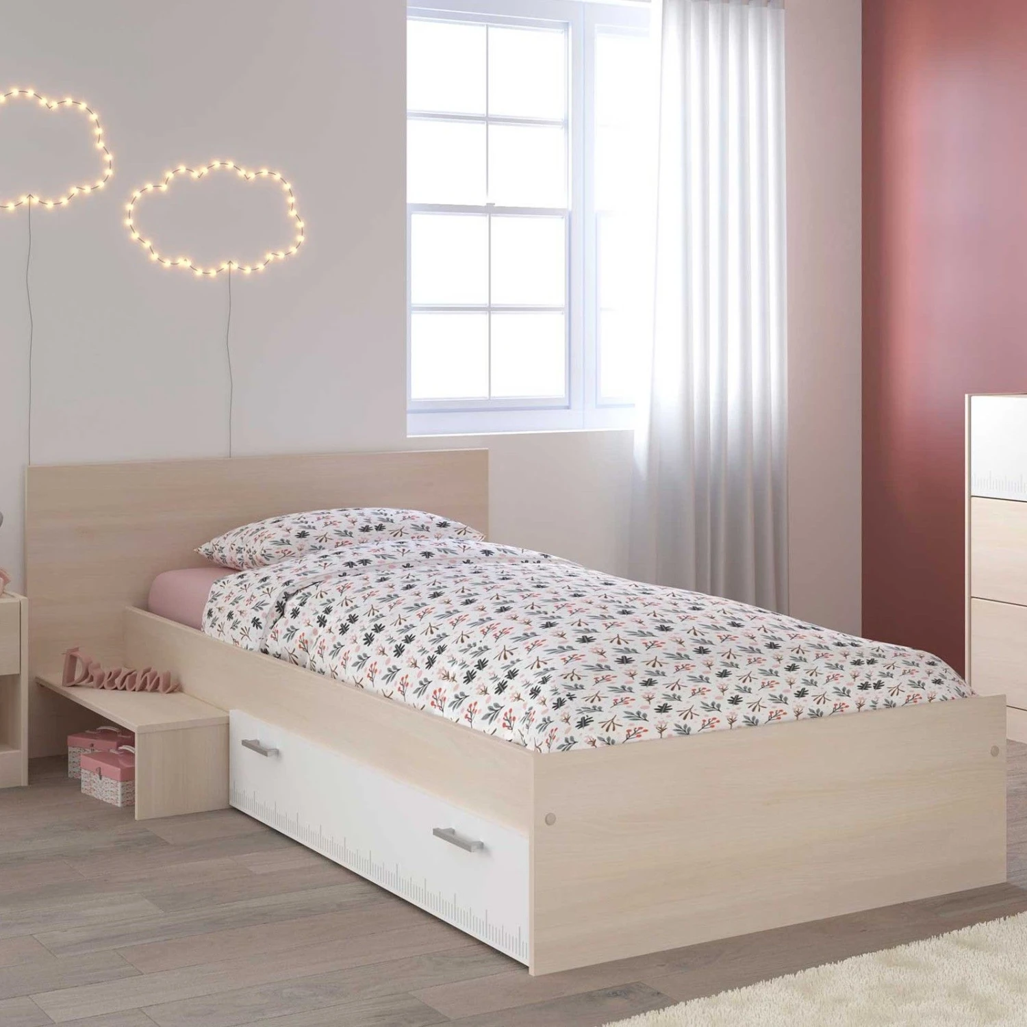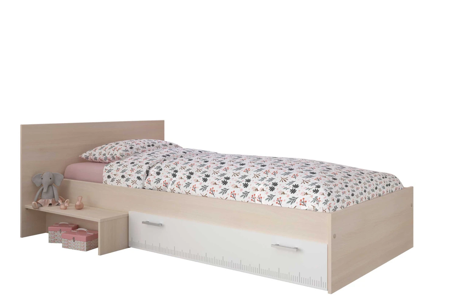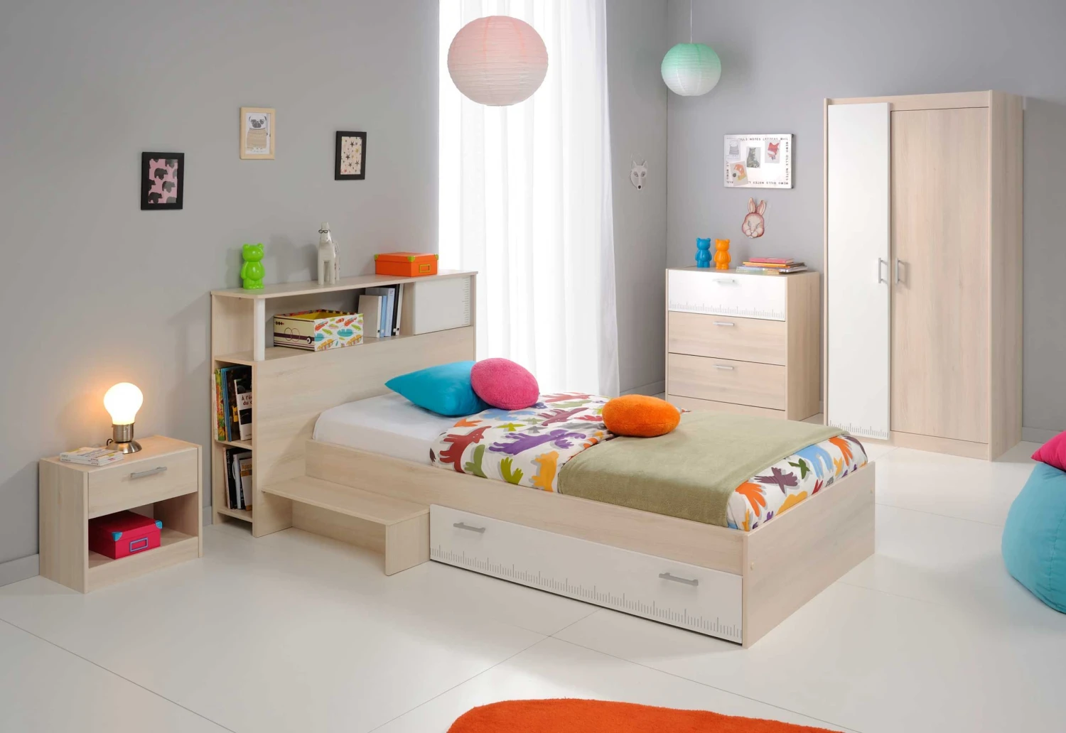 Kinderbed Charly, vervaardigd uit spaanplaat, is geschikt voor een matras van 90 x 200 cm. Deย bedlade, ideaal om beddengoed in op te bergen, en het opstapje kunnen aan beide kanten van het bed gemonteerd worden. Deย achterbouwย van het bed (optioneel) is perfect om te gebruiken als boekenkast. Dit bed, van het Franse merk Parisot, is ook beschikbaar als halfhoogslaper.