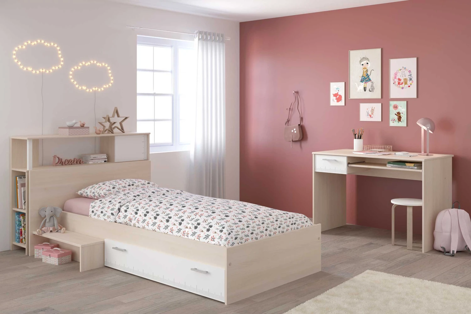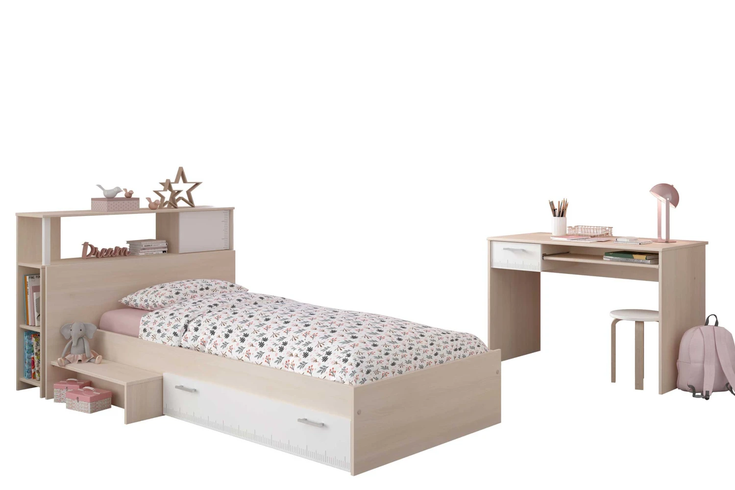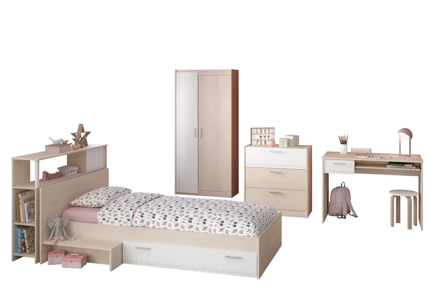 De Charly collectie herken je meteen aan hetย stijlvolle design. De meubelen zijn lichtbruin en hebben witte accenten.