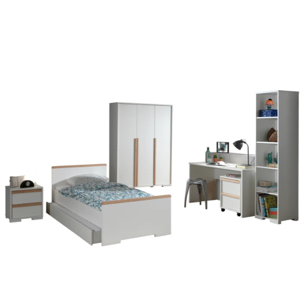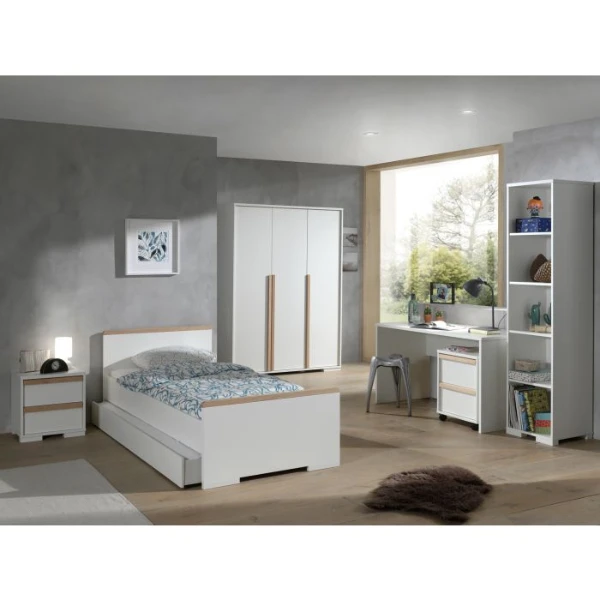 Richt de slaapkamer van je dochter of zoon stijlvol in met de meubelen uit de London-collectie. Deze stevige kindermeubelen zijn gemaakt van spaanplaat en afgewerkt met een wit laagje melamine. De massief houten accenten zorgen voor een warme sfeer in de kinderkamer. Kinderkamer London bestaat uit een bed (lattenbodem en matras van 90×200 cm niet inbegrepen), een bedlade (geschikt voor Cool matras 90×190 cm, deze is niet inbegrepen) een nachtkastje 48x40x49 cm, een 3-deurs kleerkast 146x56x195 cm, een bureau 140x65x75 cm, een rolcontainer 48x40x60 cm en een boekenkast 46x45x195 cm.