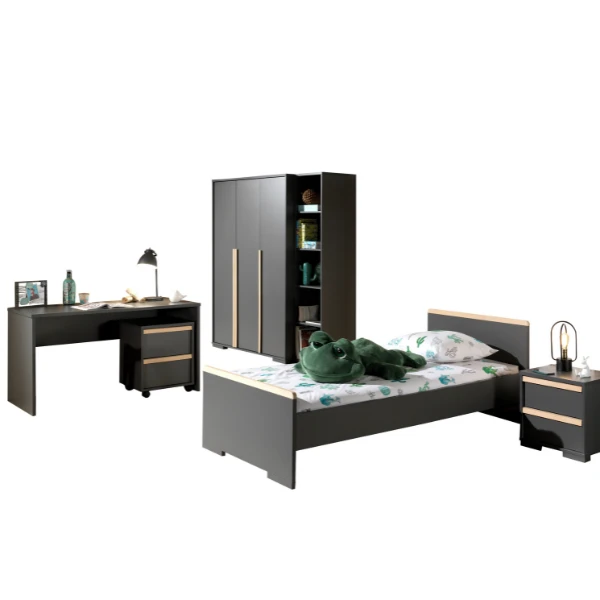 Kinderkamer London is gemaakt uit gelamineerde spaanplaat in antraciet met accenten in beukenhout.ย