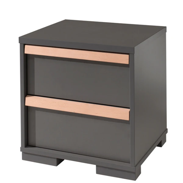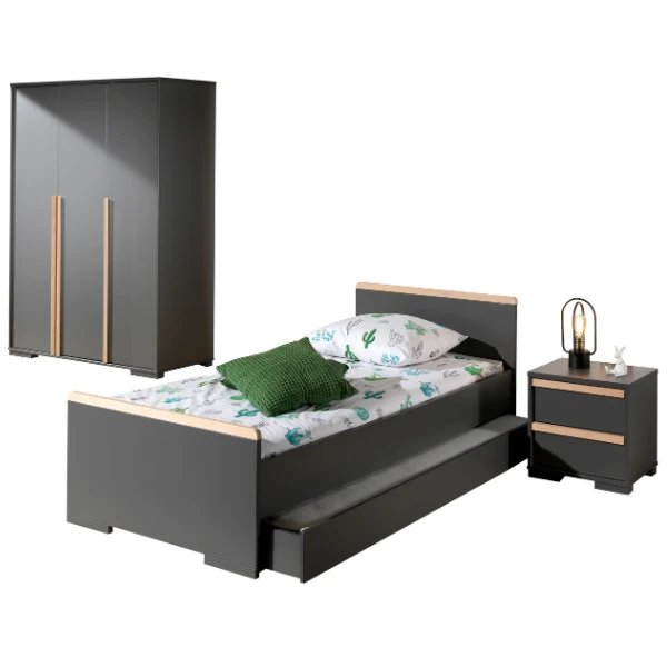 Kinderkamer London is gemaakt uit gelamineerde spaanplaat in antraciet met accenten in beukenhout.ย