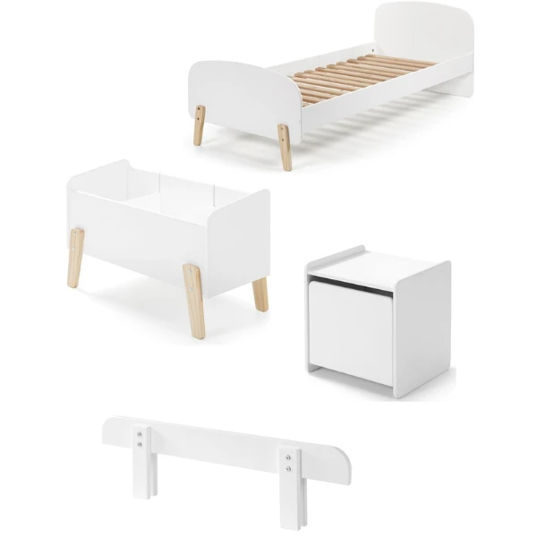 Kinderkamer Kiddy bestaat uit een bed 90×200 cm met lattenbodem (matras van 90×200 cm niet inbegrepen) , nachttafel 40x36x41 cm, bedhekje 91x6x25 cm, en een speelkoffer 80x39x48 cm.