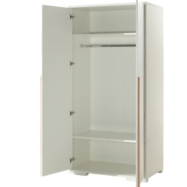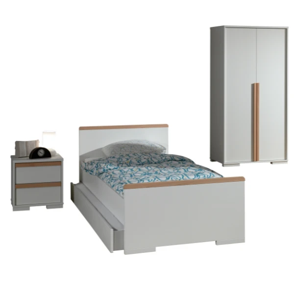 Richt de slaapkamer van je dochter of zoon stijlvol in met de meubelen uit de London-collectie. Dezeย stevige kindermeubelen zijn gemaakt van spaanplaat en afgewerkt met een wit laagje melamine. Deย massief houten accentenย zorgen voor eenย warme sfeerย in de kinderkamer.Kinderkamer London bestaat uit een bed (lattenbodem en matras van 90×200 cm niet inbegrepen), een bedlade (geschikt voor Cool matras 90×190 cm, deze is niet inbegrepen) een nachtkastje 48x40x49 cm en een 2-deurs kleerkast 98x56x195 cm.