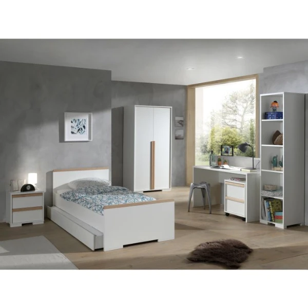 Richt de slaapkamer van je dochter of zoon stijlvol in met de meubelen uit de London-collectie. Dezeย stevige kindermeubelen zijn gemaakt van spaanplaat en afgewerkt met een wit laagje melamine. Deย massief houten accentenย zorgen voor eenย warme sfeerย in de kinderkamer. Kinderkamer London bestaat uit een bed (lattenbodem en matras van 90×200 cm niet inbegrepen), een bedlade (geschikt voor Cool matras 90×190 cm, deze is niet inbegrepen) een nachtkastje 48x40x49 cm, een 2-deurs kleerkast 98x56x195 cm, een bureau 140x65x75 cm, een rolcontainer 48x40x60 cm en een boekenkast 46x45x195 cm.ย