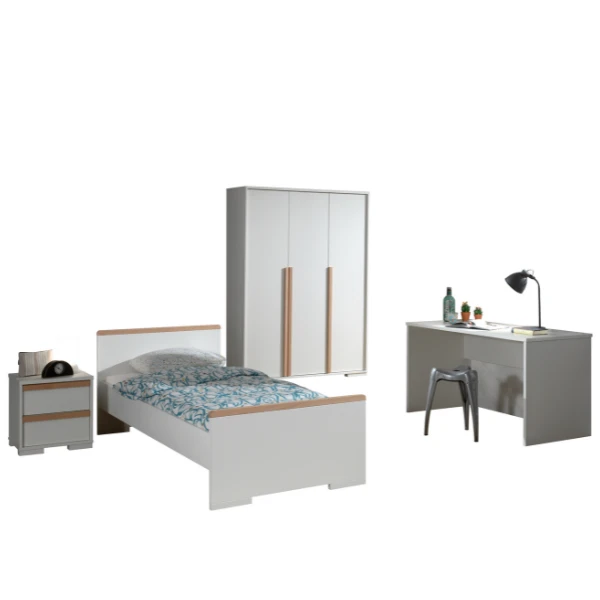 Kinderkamer London bestaat uit een bed (lattenbodem en matras van 90×200 cm niet inbegrepen), een nachtkastje 48x40x49 cm, een 3-deurs kleerkast 146x56x195 cm en een bureau 140x65x75 cm.ย