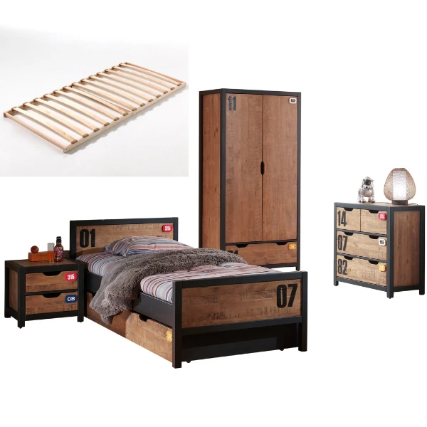 Maak kennis met de perfecte kinderkamer voor jongens die het graag net ietsย stoerder en stevigerย zien. Je zoon zal zich helemaal thuis voelen in deze mooie jongenskamer! Kinderkamer Alex bestaat uitย een nachttafel 50x45x45 cm, bed met lattenbodem 90×200 cm (matras 90×200 cm niet inbegrepen), bedlade 90×190 cm (matras 90×190 niet inbegrepen), commode 86x42x83 cm en 2-deurs kast 100x55x200 cm. De kamer is gemaakt uit MDF en massief dennenhout.ย