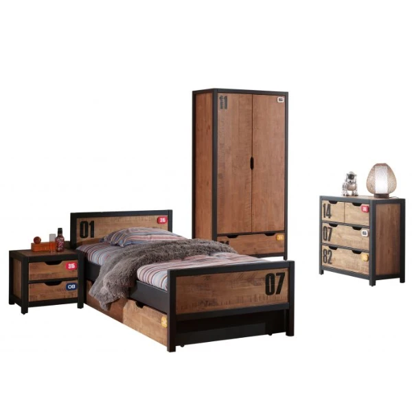 ย Maak kennis met de perfecte kinderkamer voor jongens die het graag net ietsย stoerder en stevigerย zien. Je zoon zal zich helemaal thuis voelen in deze mooie jongenskamer! Kinderkamer Alex bestaat uitย een nachttafel 50x45x45 cm, bed 90×200 cm (matras en lattenbodem 90×200 cm niet inbegrepen), bedlade 90×190 cm (matras 90×190 niet inbegrepen), commode 86x42x83 cm en 2-deurs kast 100x55x200 cm. De kamer is gemaakt uit MDF en massief dennenhout.ย