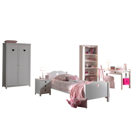 Laat je verleiden door dezeย lieflijke meisjeskamer Amori, een creatie van het gespecialiseerde merkย Vipack, waar je dochter zich zonder twijfel helemaal thuis zal voelen. Deย schattige hartjesย voorzien de kamer van eenย romantische finishing touch! Kinderkamer Amori bestaat uitย een bed 90×200 cm (lattenbodem van 90×200 cm niet inbegrepen), een nachttafel 45x40x55 cm, 2-deurs kast 110x57x191 cm, bureau 130x60x85 cm en boekenkast 90x40x190 cm . Matras van 90×200 cm niet inbegrepen.ย