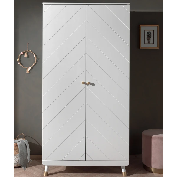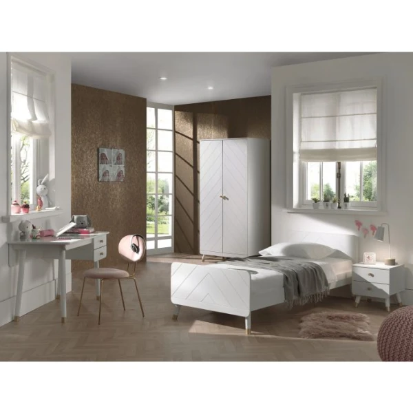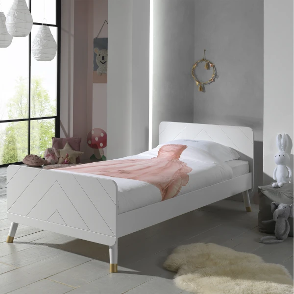 Deย kindermeubelcollectie Billyย combineert een leukย Scandinavisch retro-ontwerpย met moderne details. De meubels zijn gemaakt uitย hoogwaardig witgelakt MDF. Hetย grafische patroon en de goudkleurige detailsย geven de collectie net dat beetje extra. Deze combinatie omvatย een bed, nachtkastje, bureau en 2-deurs kleerkast.