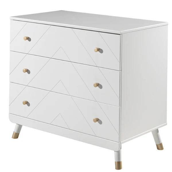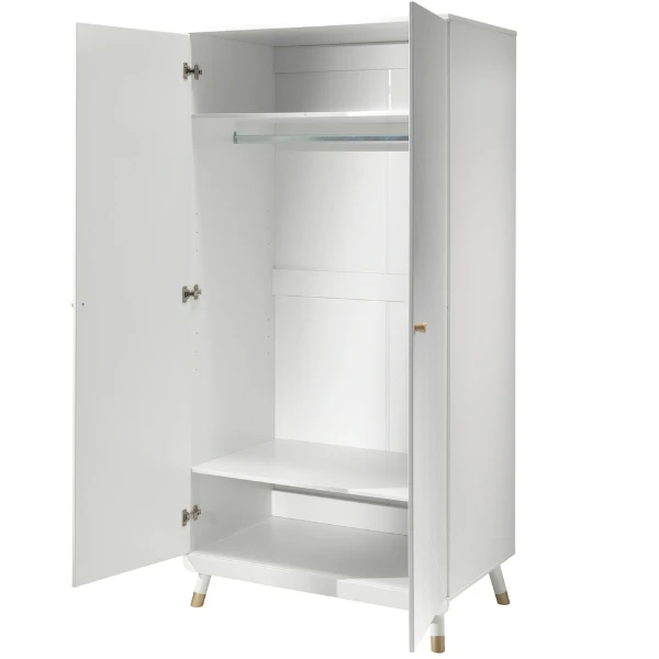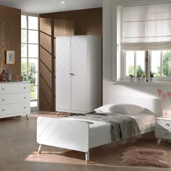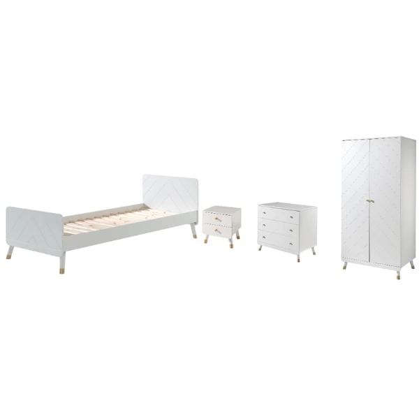 Deย kindermeubelcollectie Billyย combineert een leukย Scandinavisch retro-ontwerpย met moderne details. De meubels zijn gemaakt uitย hoogwaardig witgelakt MDF. Hetย grafische patroon en de goudkleurige detailsย geven de collectie net dat beetje extra. Deze combinatie omvatย een bed, nachtkastje, commode en 2-deurs kleerkast.