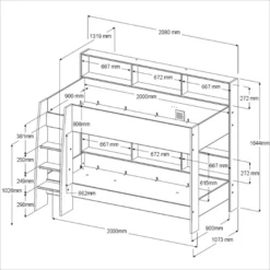 Het eenpersoonskinderbed (afmetingen: 193 x 121 x 67 cm) biedt een knusse slaapplek, terwijl het achterbouwstuk (afmetingen: 123 x 29 x 93 cm) en de bureautafel (afmetingen: 108,5 x 59,3 x 75 cm) allemaal hun eigen unieke functies toevoegen aan de ruimte, waardoor het een favoriete plek wordt om te spelen, studeren en dromen.