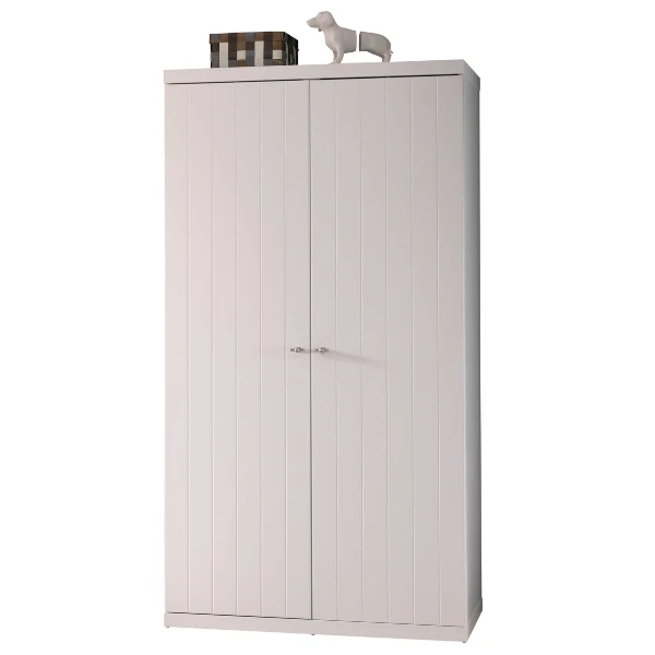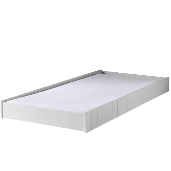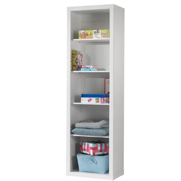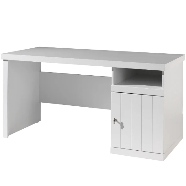 Deย neutrale witte meubelsย van kinderkamercombinatie Robin krijgenย karakterย door deย afwerking met fijne verticale lijnen. Dezeย lichtrijke kinderkamerย bestaat uit eenย bed 90×200 cm met bedladeย (matras en lattenbodem van 90×200 cm niet inbegrepen),ย een nachtkastjeย 44x40x56 cm,ย een 2-deurs kleerkastย 110x57x205 cm, eenย bureauย 150x70x76 cm enย een boekenkastย 60x40x204 cm.