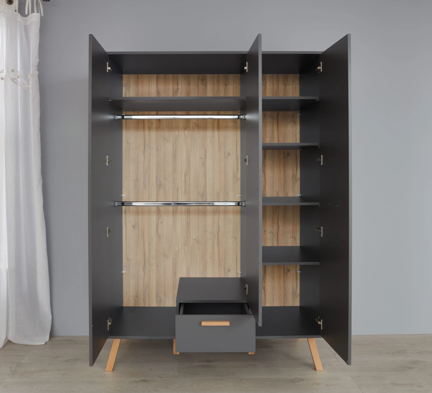 Een van de belangrijkste voordelen van deze kast is de ruime opbergruimte. Met drie deuren, een lade en meerdere planken kun je gemakkelijk je kleding, accessoires en andere spullen ordenen. Ondanks zijn grootte neemt deze kast niet te veel vloeroppervlak in beslag, waardoor hij ook geschikt is voor kleinere kamers.