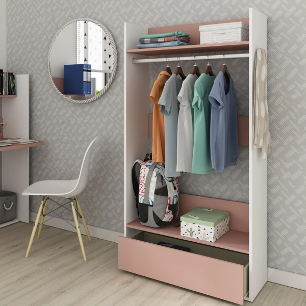 Kledingkast Bo0 Met Lade, Hoedenplank En Kledingroede – Wit/ Oudroze