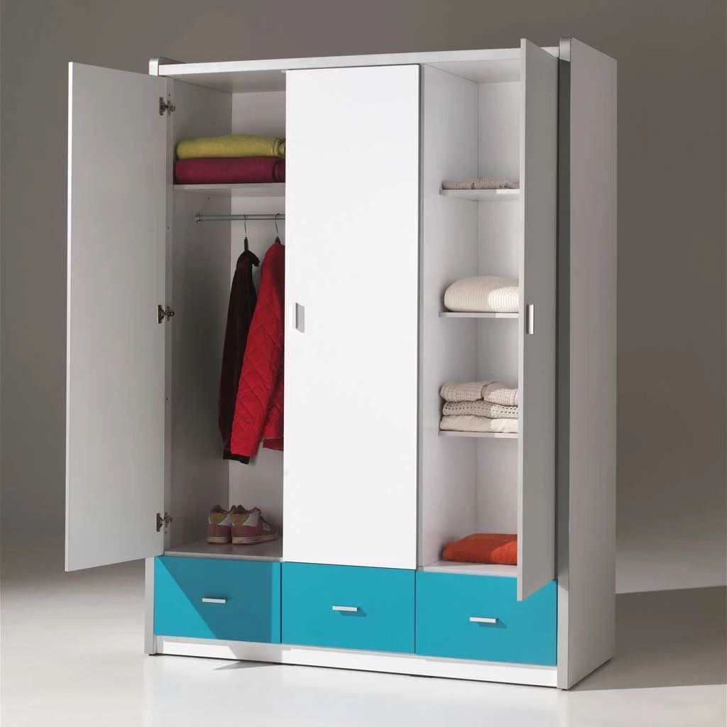 Bovenaan is er een grote legplank met daaronder een kledingroede. De rechterdeur herbergt 3 legplanken. Onderaan zijn er 3 lades voorzien. Deze kledingkasten zijn beschikbaar in dezelfde kleuren als de halfhoogslapers. De montage ervan is zeer eenvoudig dankzij de meegeleverde instructies. Kortom, een must-have als je kiest voor deze collectie! Wil je liever een kleinere kledingkast? Er is ook een versie met 2 deuren beschikbaar!