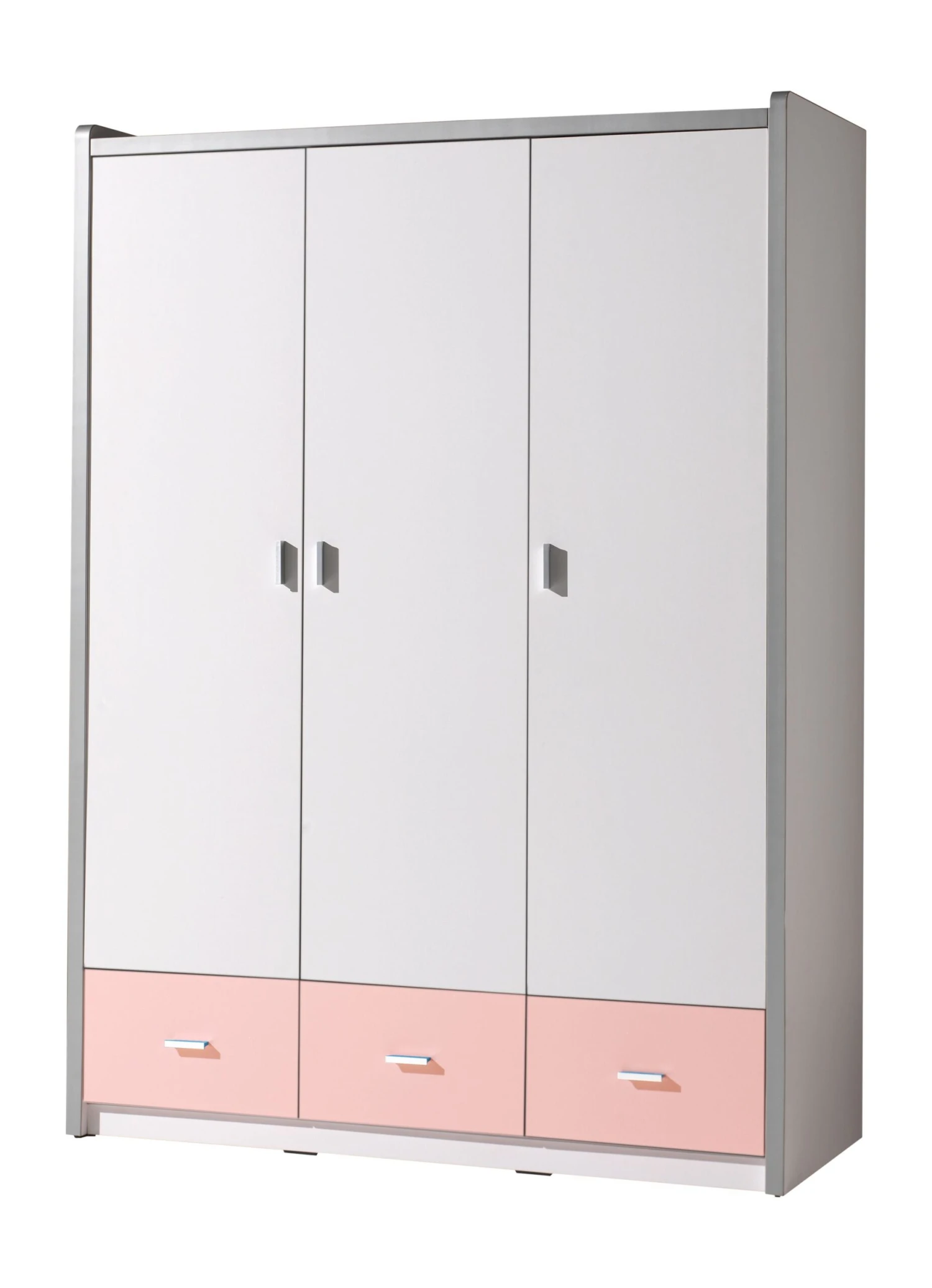 Deze Bonny kledingkast met roze accenten past perfect bij de Bonny halfhoogslaper. Dit is een moderne 3-deurs kast in hoogwaardig wit beklede houtvezelplaat van 36 en 15 mm dik, afgewerkt met een zilverkleurige lijst in PVC en met metalen handgrepen. Het gekleurde paneel is gemaakt van hoogwaardig MDF.