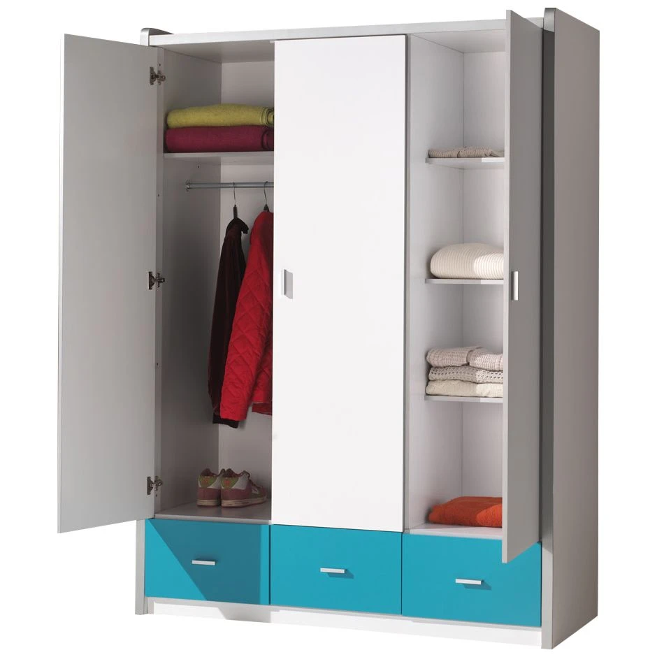 Deze Bonny kledingkast met turquoise accenten past perfect bij de Bonny halfhoogslaper. Dit is een moderne 3-deurs kast in hoogwaardig wit beklede houtvezelplaat van 36 en 15 mm dik, afgewerkt met een zilverkleurige lijst in PVC en met metalen handgrepen. Het gekleurde paneel is gemaakt van hoogwaardig MDF.