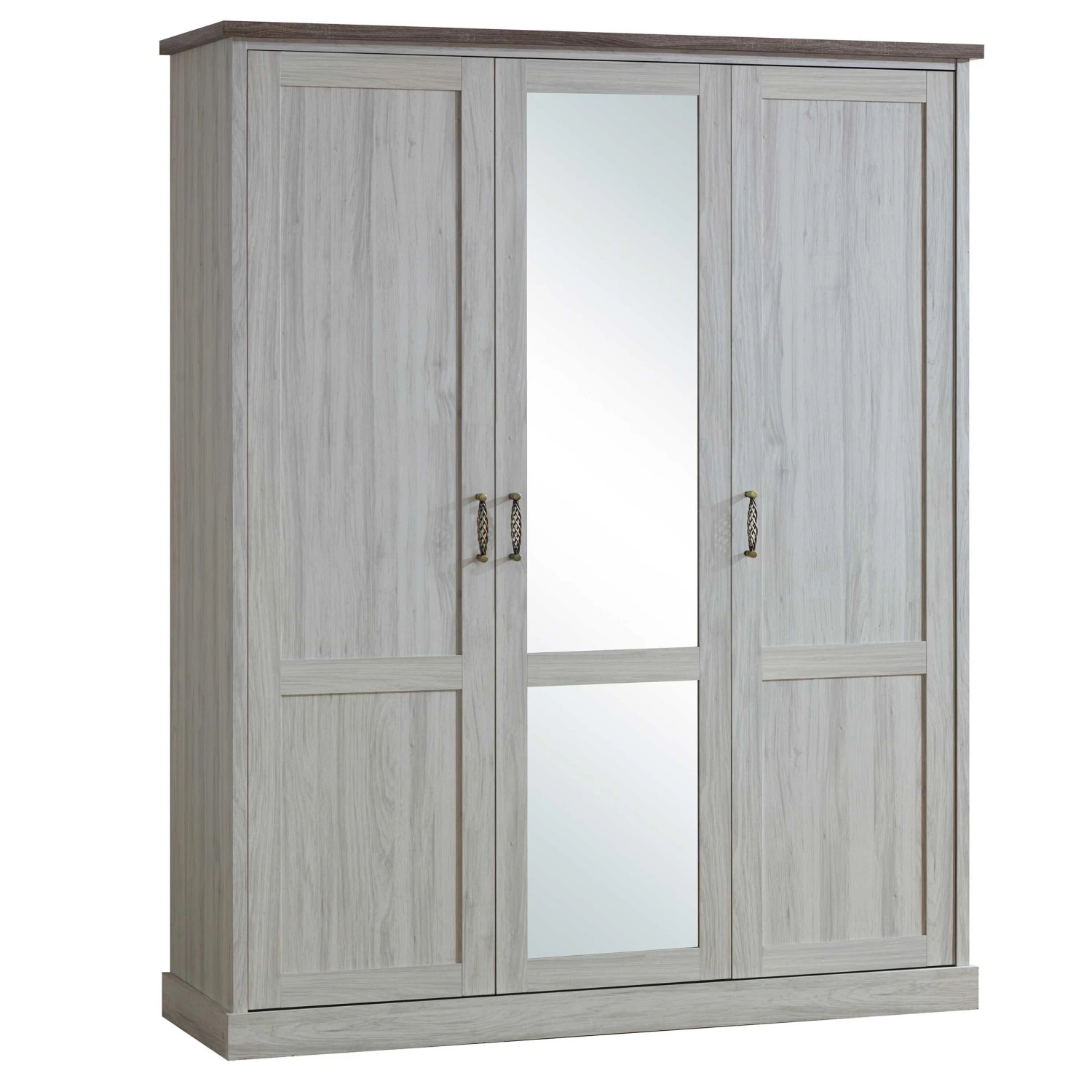 Deze Emily kledingkast bestaat uit spaanplaat met een lichtgrijs eikdecor en een bruine afwerking. Open de drie draaideuren met de elegante handvaten. De kast telt twee kledingroedes en acht legplanken. Deze ruime kleerkast is ook ideaal voor in een meisjeskamer.