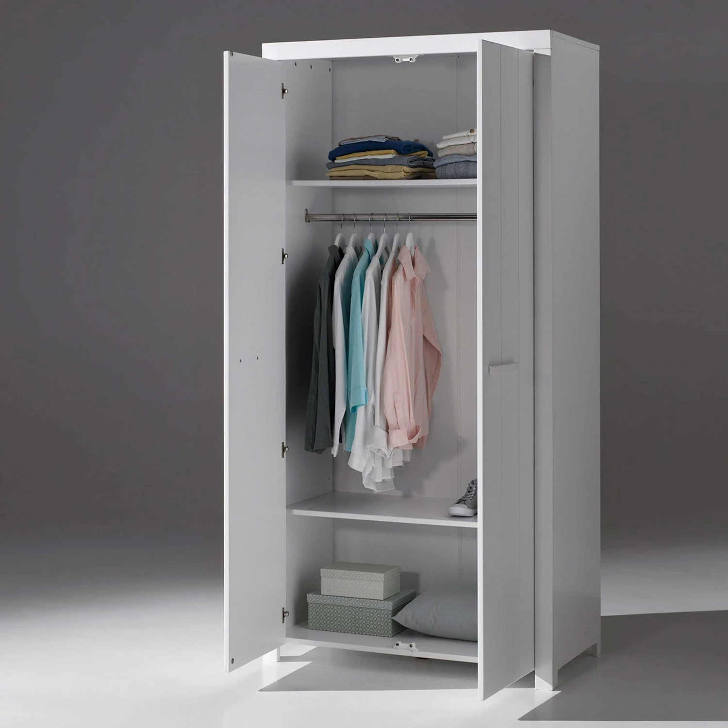 Daarnaast beschikt de kast ook over een kledingroede en twee legplanken zodat je voldoende mogelijkheden hebt om je kleren op te bergen.ย