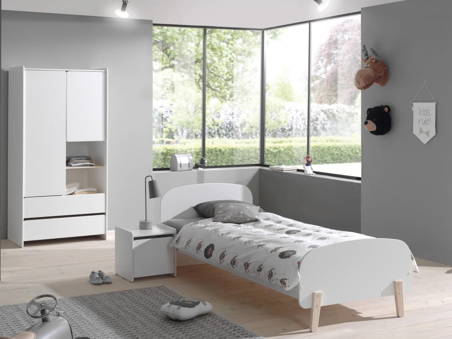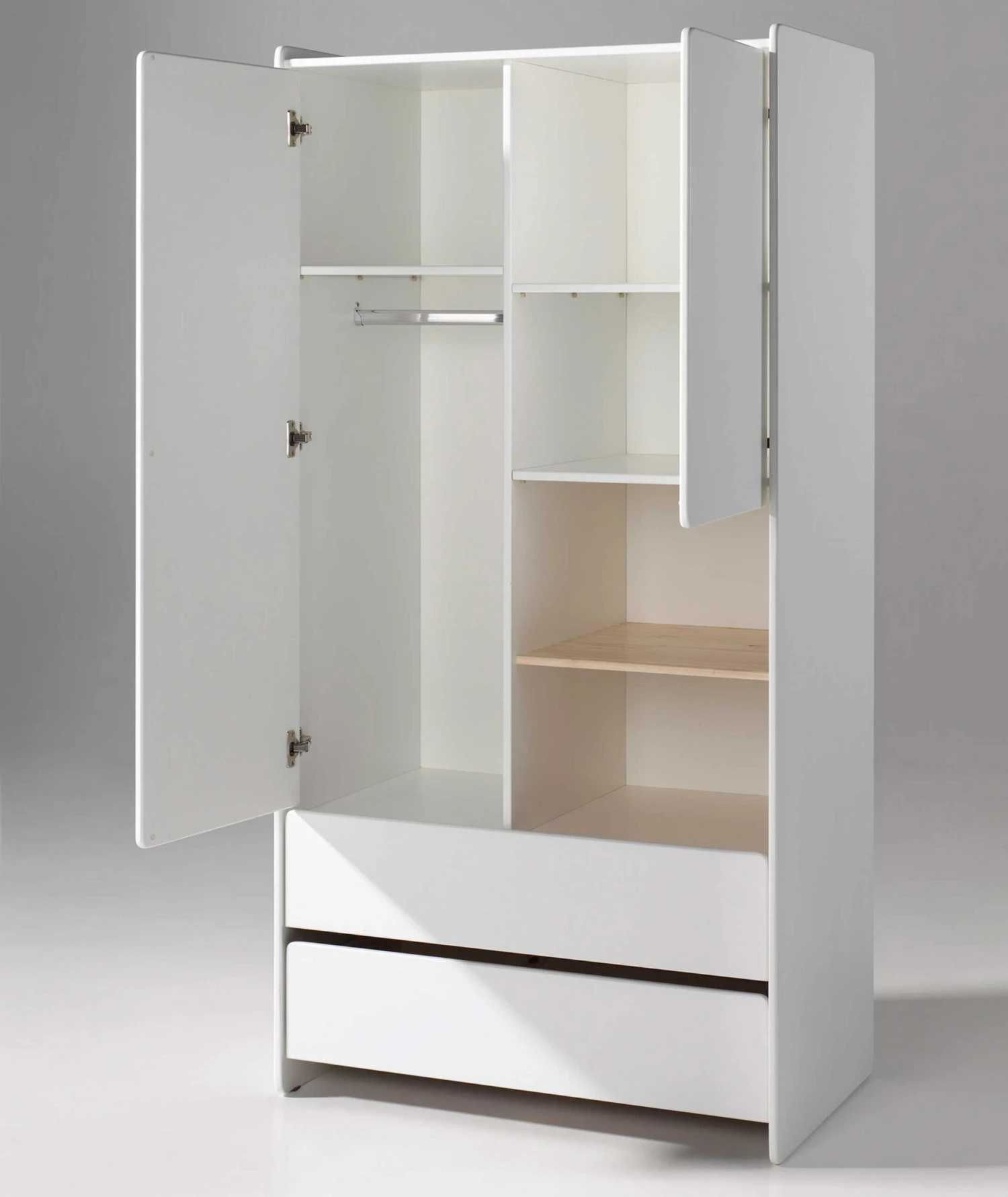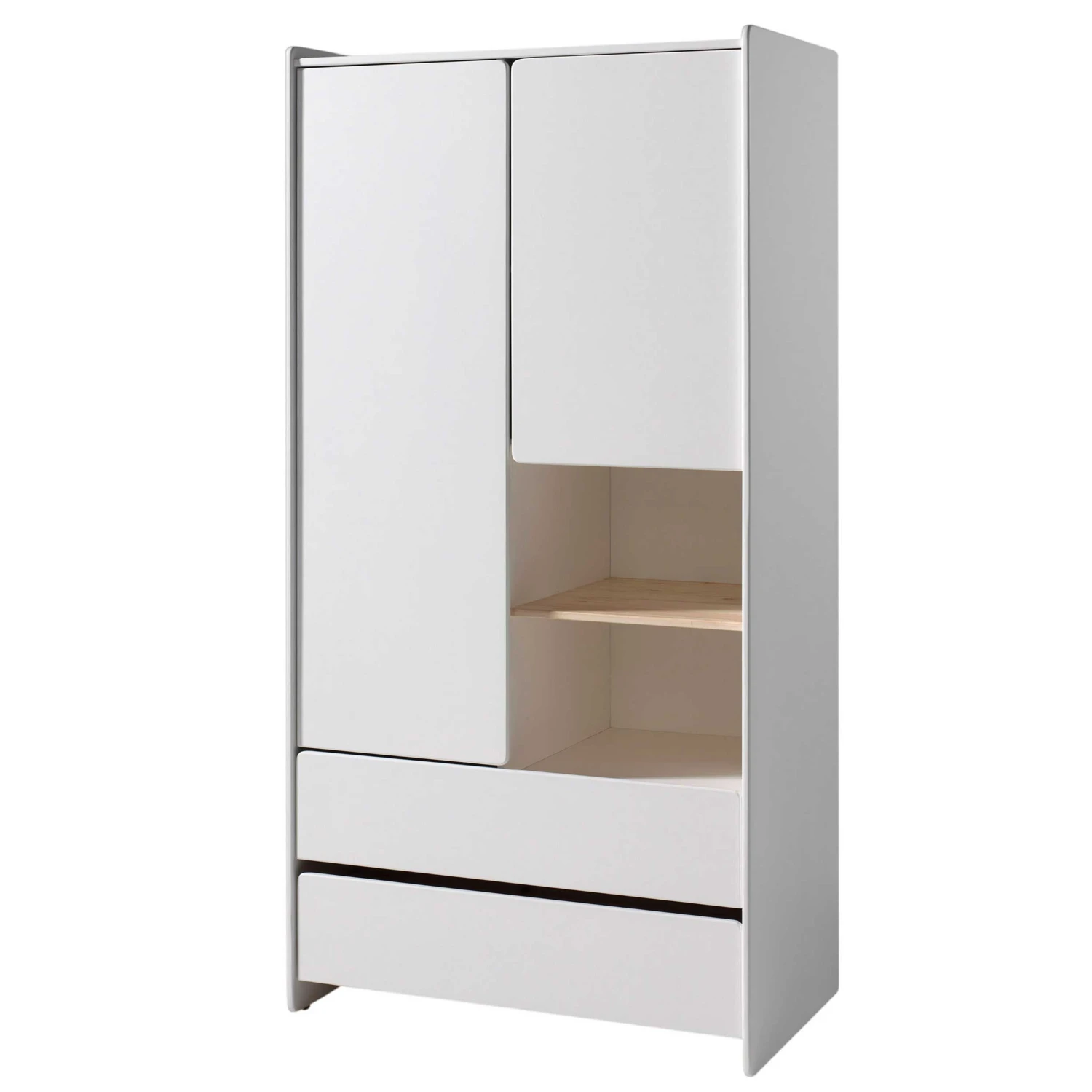 Kledingkast Kiddy is een onmisbaar onderdeel van de Kiddy-collectie. Deze kast bestaat uit 2 deuren, 2 laden en 2 open vakken die gescheiden worden door een natuurkleurige legplank van massief den. Achter de lange deur vind je een legplank en een kledingroede. Achter de korte deur vind je 2 opbergvakken die opnieuw gescheiden worden door een legplank.