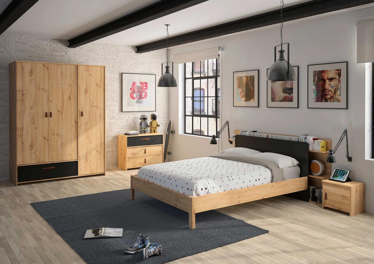 De meubelen van de Liam slaapkamer zijn vervaardigd uit spaanplaat met een artisan eikdecor. De zwarte accenten en bruine, lederen handgrepen geven een stoere toets aan de kamer.