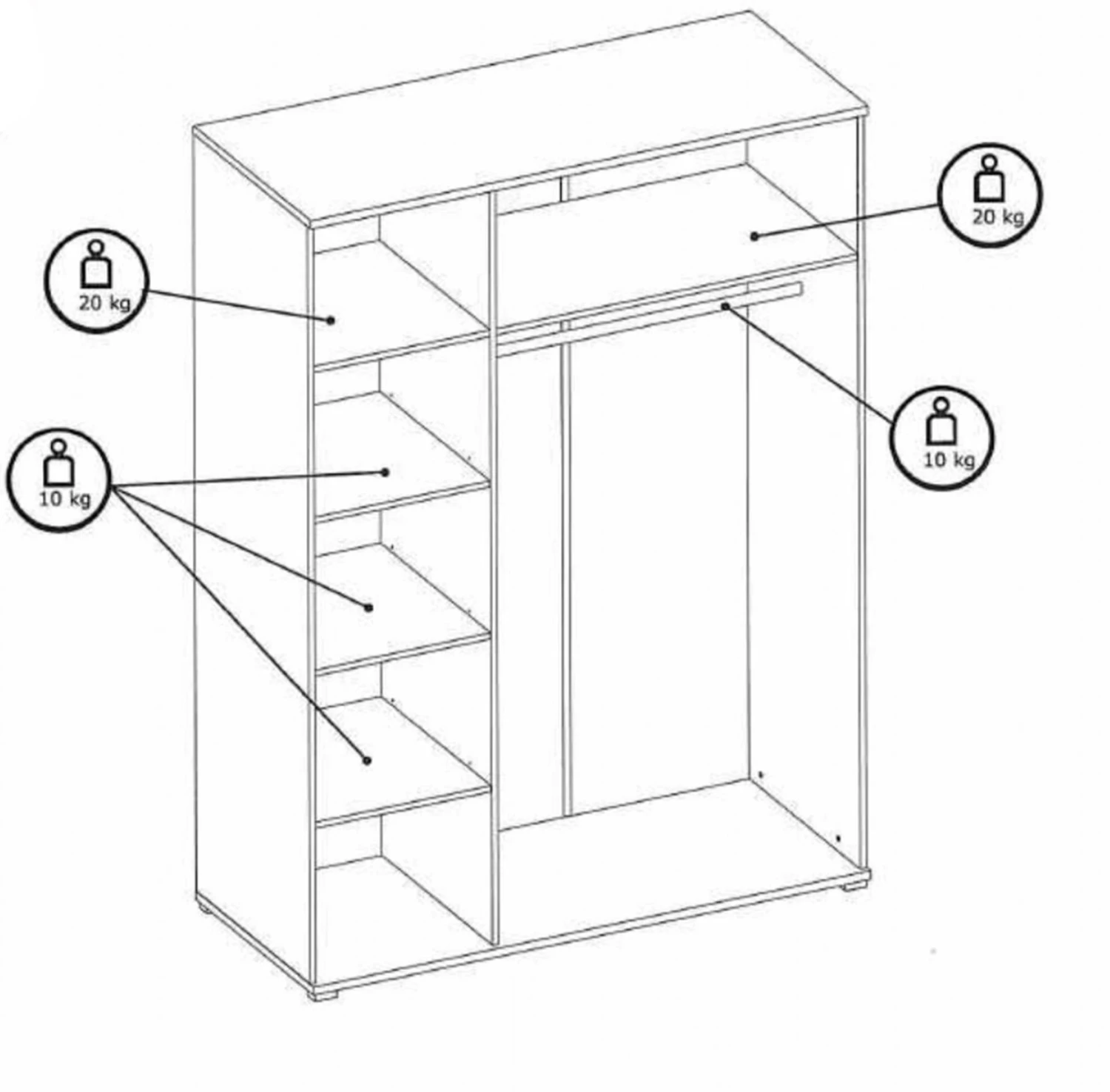 Deze Soma kledingkast heeft 3 draaideuren, waarvan 1 deur met een grote spiegel. Achter de dubbele deur vind je een roede en een ruime legplank, achter de enkele deur 4 legplanken. Je beschikt dus over heel wat opbergruimte voor je kledij!ย