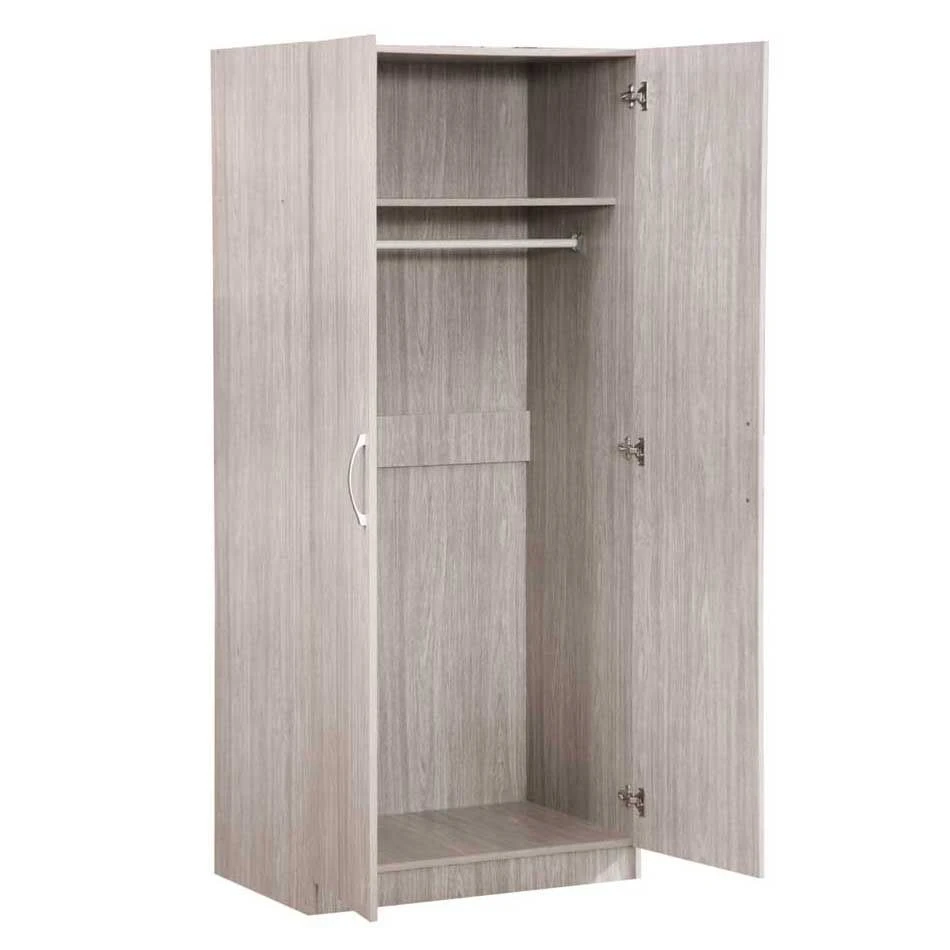 Deze compacte Tomorrow kleerkast is vervaardigd uit spaanplaat met een eikdecor en heeft twee draaideuren. De kast beschikt over een legplank en een kledingroede.