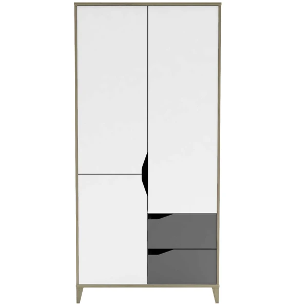 Kleerkast Gerry is gemaakt uit gemelamineerde spaanplaat in mat wit en lichtgrijs en heeft randen in Kronberg eikdecor. De kast heeft uitgesneden handgrepen en bestaat uit 3 draaideuren, 4 legplanken, een kledingroede en 2 lades. De poten zijn uit plastiek met Kronberg eikdecor.ย