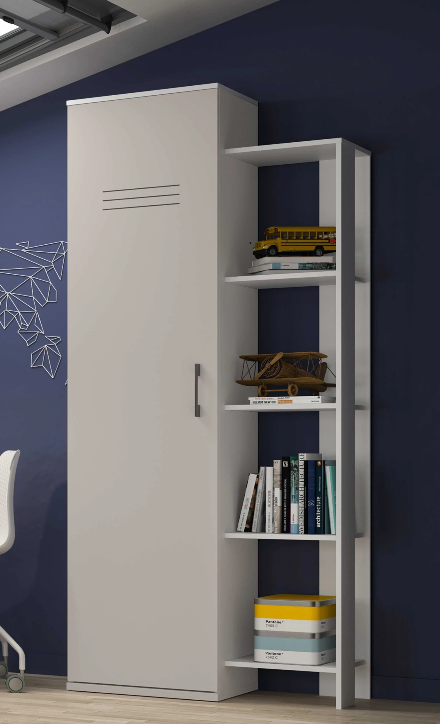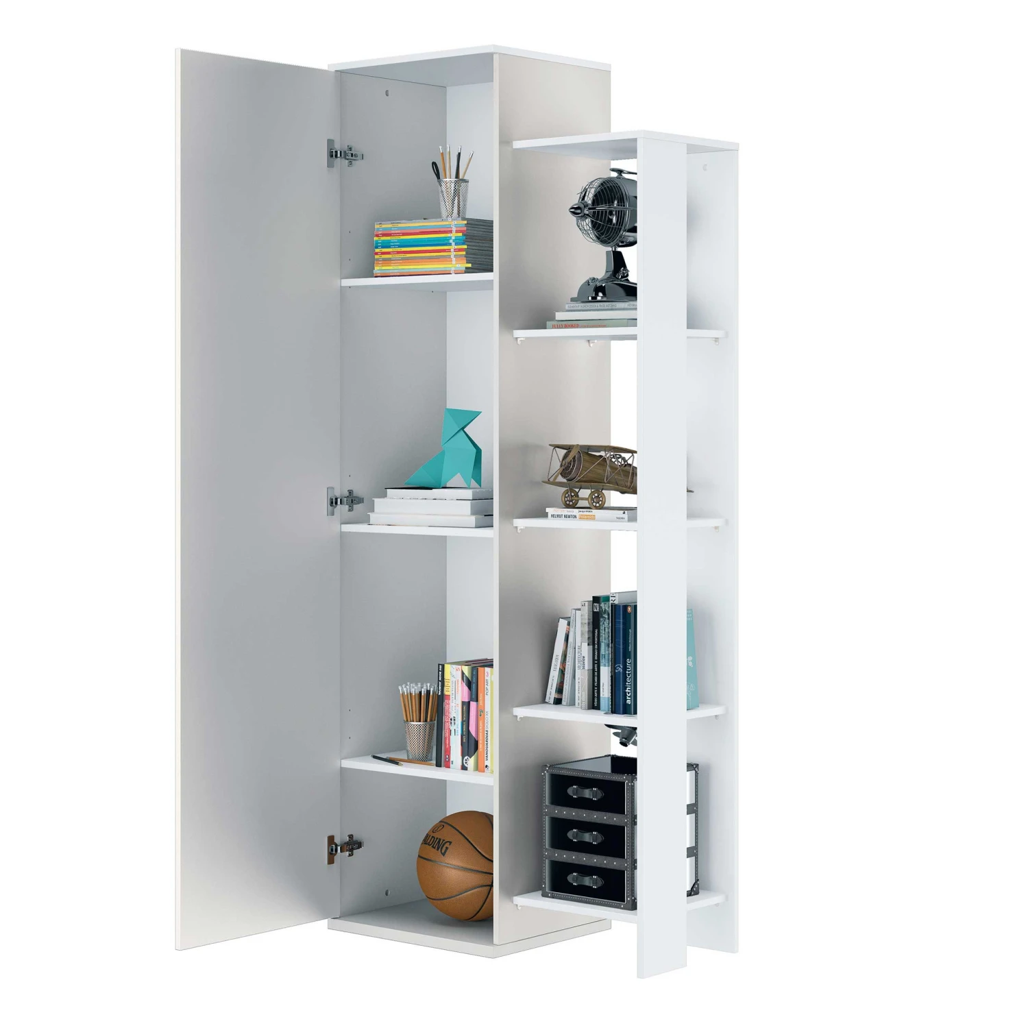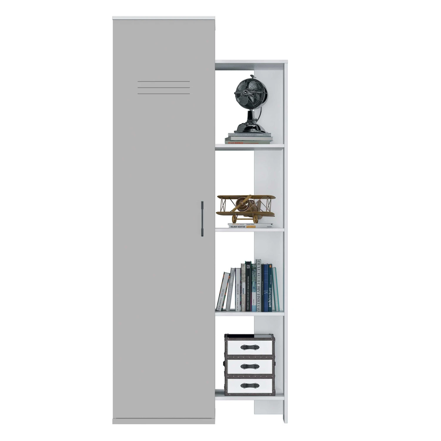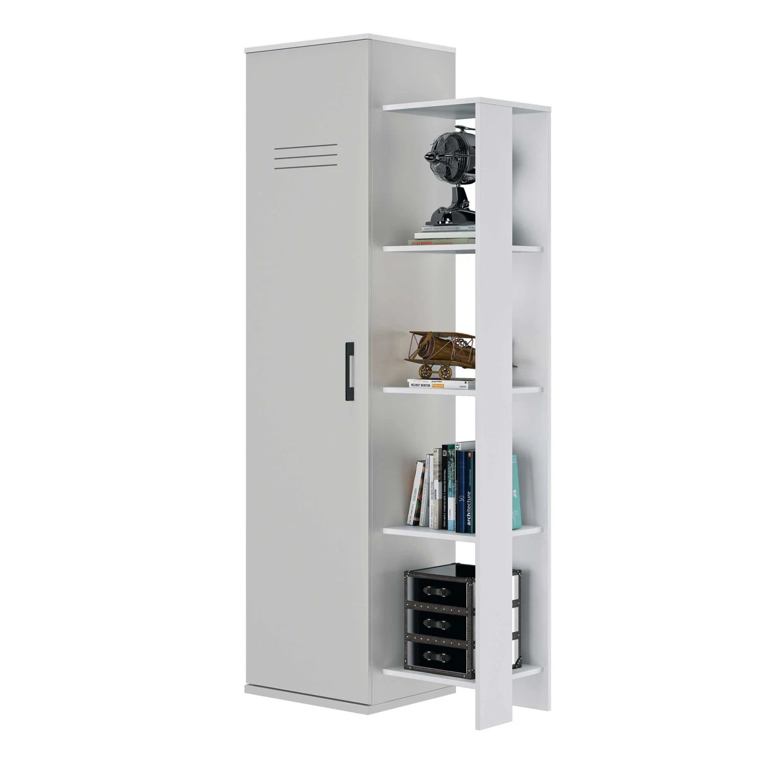 Deze kolomkast uit de Hugo collectie bestaat uit 4 open vakken en een deur met daarachter 3 legplanken. De deur is bovenaan versierd met 3 groeven, waardoor de kast wel een locker lijkt.