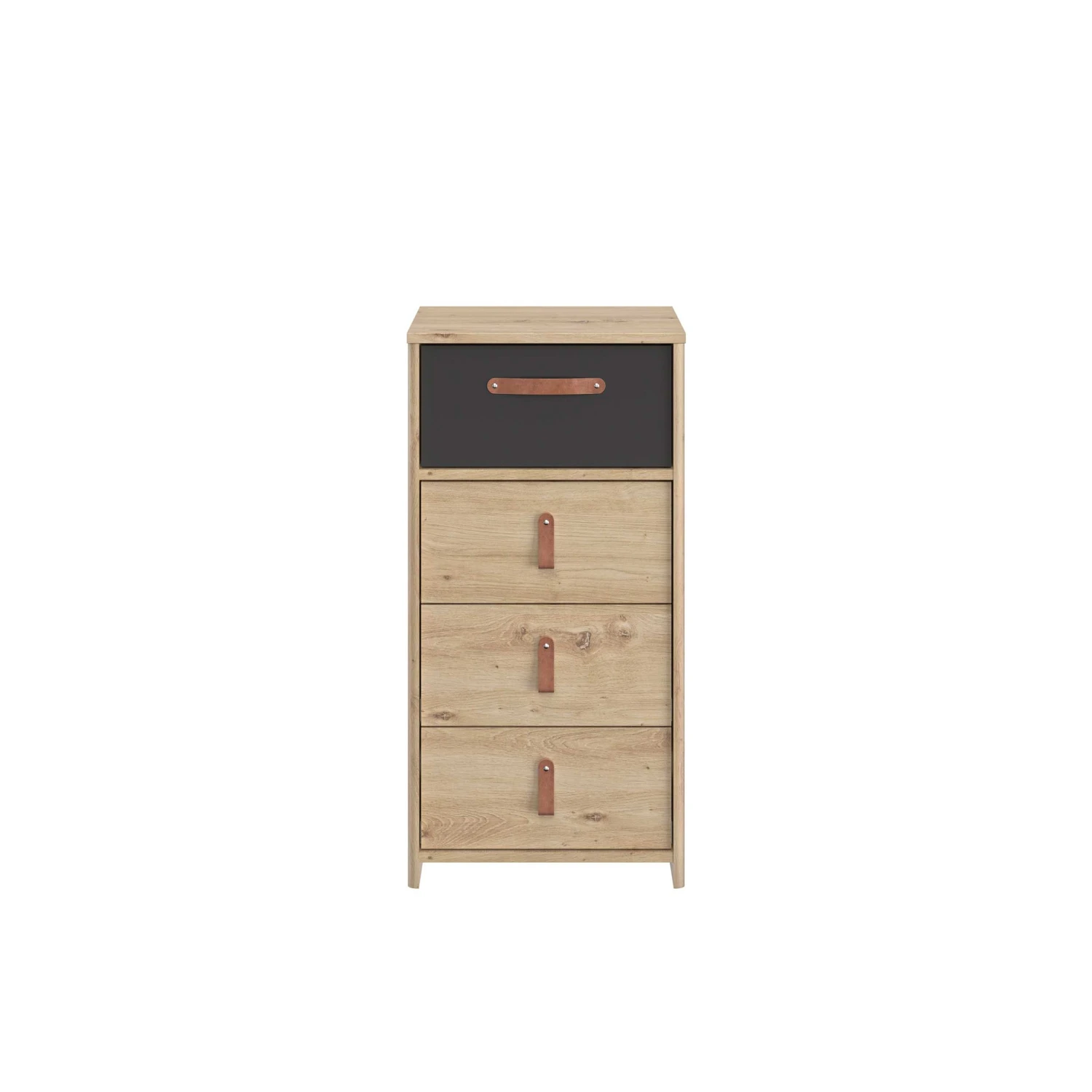 Ladekast Liam in artisan eik/zwart met 4 lades en bruine handgrepen.