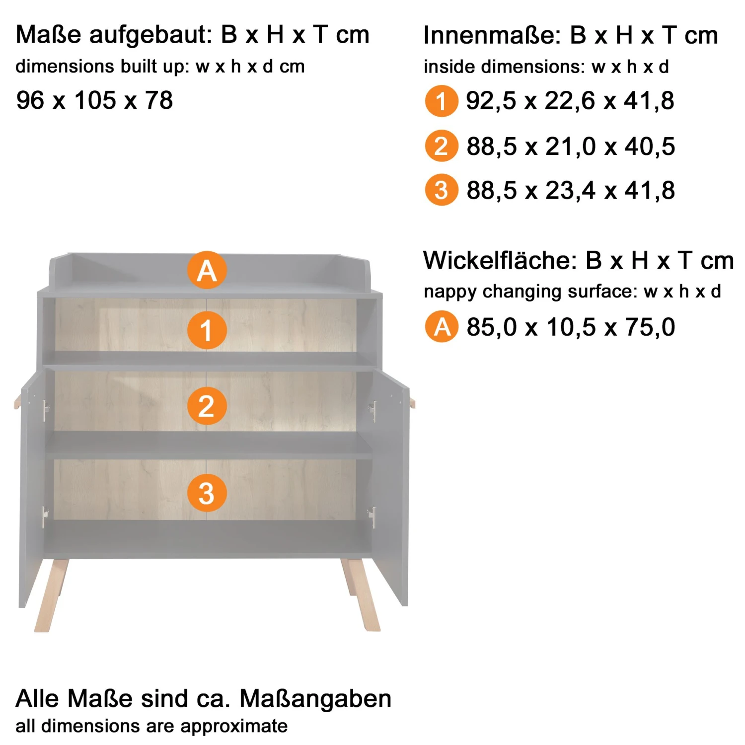 Met zijn afmetingen van 96 x 78 x 105 cm biedt deze luiertafel voldoende opbergruimte met twee deuren, een open vak en een legplank. Het grote verschoonoppervlak aan de voorkant zorgt voor comfort en gemak tijdens het verschonen.